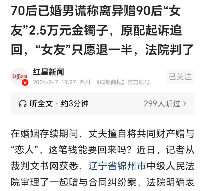 辽宁,一70后男子,谎称离婚,与90后女子谈恋爱,并送给对方一只两万多元的金手镯。哪知道,男子妻子找上门,称他们没有离婚,这是共同财产,要求女子返还,女子不愿意。妻子将女子告上法庭,法院判了。 35岁的周某原本以为,自己遇到了一个成熟稳重、真心待她的男人,却没想到,对方被对方精心编织的“离异单身”人设骗了。 53岁的王某长期混迹于棋牌室,日子过得松散随意。正是在这样的场合,他结识了比自己小18岁的周某。两人初次接触时,王某表现得极为坦诚,主动强调自己“已经离异”“一个人生活”,言谈间透露出对周某的好感。 面对年龄差距,周某并没有马上投入感情。她态度谨慎,只是普通接触。但王某显然不打算慢慢来。他频繁示好、刻意营造安全感,反复强调自己没有家庭负担,希望尽快确定关系。 2025年8月20日,王某带着周某走进金店,挑选了一只价值25012元的金手镯,并当场为她戴在手腕上。这一举动,成了关系的分水岭。在周某看来,这是对方认真对待感情的直接证明。她并未索要,也未提出任何经济要求,只是在“被选择”的情绪中,接受了这份礼物。 几天后,两人正式确定恋爱关系。然而,这段关系的“保质期”,短得令人猝不及防。没过多久,周某接到一个陌生来电。电话那头的女子自称翟某,是王某的合法妻子。她语气冷静而明确:两人并未离婚,只是闹矛盾分居;那只金手镯,是王某用夫妻共同财产购买,要求周某立即返还。 这一通电话,几乎击碎了周某对这段感情的全部认知。她第一反应是否认,质问对方:“不是已经离婚了吗?”得到的回答却异常清楚——从未办理过离婚手续。 周某随即联系王某,得到的却不是解释和承担,而是态度的急转直下。前一秒还在说“以后一起过日子”的男人,很快站到了妻子一边,明确表示:手镯属于夫妻共同财产,应该返还。 周某感到愤怒,也感到不公。她认为,自己从始至终都是被欺骗的一方。若知道王某仍在婚姻关系存续期间,她绝不可能与其交往,更不可能接受如此贵重的礼物。她并未主动索取财物,更未参与隐瞒事实。 基于这一立场,周某提出折中方案:同意返还一半金额,另一半应由王某自行承担责任。她认为,这是对“过错分担”的合理体现。 但事情并未朝着情理方向发展。2025年秋,翟某将周某起诉至法院,要求返还金手镯对应的全部价款。王某在诉讼中并未为周某作任何辩解,反而明确支持妻子的诉求,确认该赠与行为无效。 案件进入司法审理阶段后,争议的焦点逐渐清晰:一个隐瞒婚姻状况的男人,用夫妻共同财产向第三人赠与大额财物,该行为是否有效?第三人是否可以因“被欺骗”而免除返还责任? 法院在审理中,直接适用了《民法典》第153条的规定。该条明确,违背公序良俗的民事法律行为无效。婚姻关系存续期间,夫妻一方隐瞒已婚事实,以维系婚外情为目的,将夫妻共同财产赠与他人,明显违反夫妻忠实义务,也突破了社会普遍认可的婚姻伦理底线。 在这一法律评价下,赠与行为自始无效。也就是说,这只金手镯在法律上从未合法“属于”周某。 案件审理过程中,周某曾表示手镯已经丢失。法院据此判决其返还等额价款25012元,并承担相应诉讼费用。一审判决作出后,周某提起上诉,二审法院认为一审认定事实清楚、适用法律正确,维持原判。 从结果看,周某在人身和财产层面,都是“输家”。她失去了感情,也承担了经济返还责任。而那个真正制造混乱的人——王某,却几乎没有为自己的行为付出直接代价。 在法律结构中,婚姻关系具有高度稳定性和优先保护性。夫妻共同财产制度,保护的是家庭整体利益,而非个人情感得失。只要婚姻关系合法存在,任何未经配偶同意的重大财产处分行为,尤其是以不正当关系为目的的赠与,都会被严格否定。 对第三人而言,即便主观上完全不知情,也难以在财产返还问题上获得豁免。这并非对受害者的否认,而是法律在“保护婚姻秩序”与“个体公平”之间作出的价值选择。 虽然在本案中,王某并未成为直接的被告,但这并不意味着其行为完全免责。在特定条件下,受害第三人仍可另行主张侵权或缔约过失责任。 只是,在现实中,很多被伤害的一方,往往在一场官司后,已无力再追究更多。 这起案件没有赢家。原配维护了财产权,第三人付出了代价,而制造一切的始作俑者,却轻易抽身。这也再次提醒:法律可以厘清财产归属,却无法替每一段被欺骗的感情讨回公道。