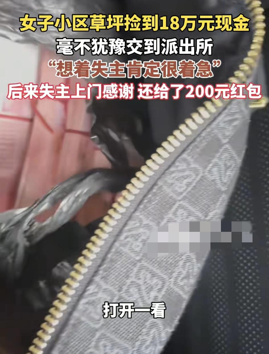 温州一女子在自家小区的草坪上捡到一个钱包,当时她只是用脚踢了一下这个包,感觉有点沉,打开一看里面有黑色塑料袋装着大袋的现金,与物业联系之后,发现失主是与自己同楼层的邻居。原来这些钱都是邻居刚结完婚当天收回来的礼金,这些礼金是他的妈妈准备带回老家,当天准备坐车时把包放在了草坪上,上车时忘记了拿,后来邻居给他发了200千元的红包表示感谢。很多人说捡到这些钱不归还,会怎么样。现在满大街都是监控,不归还自然也会找到捡到钱的人。