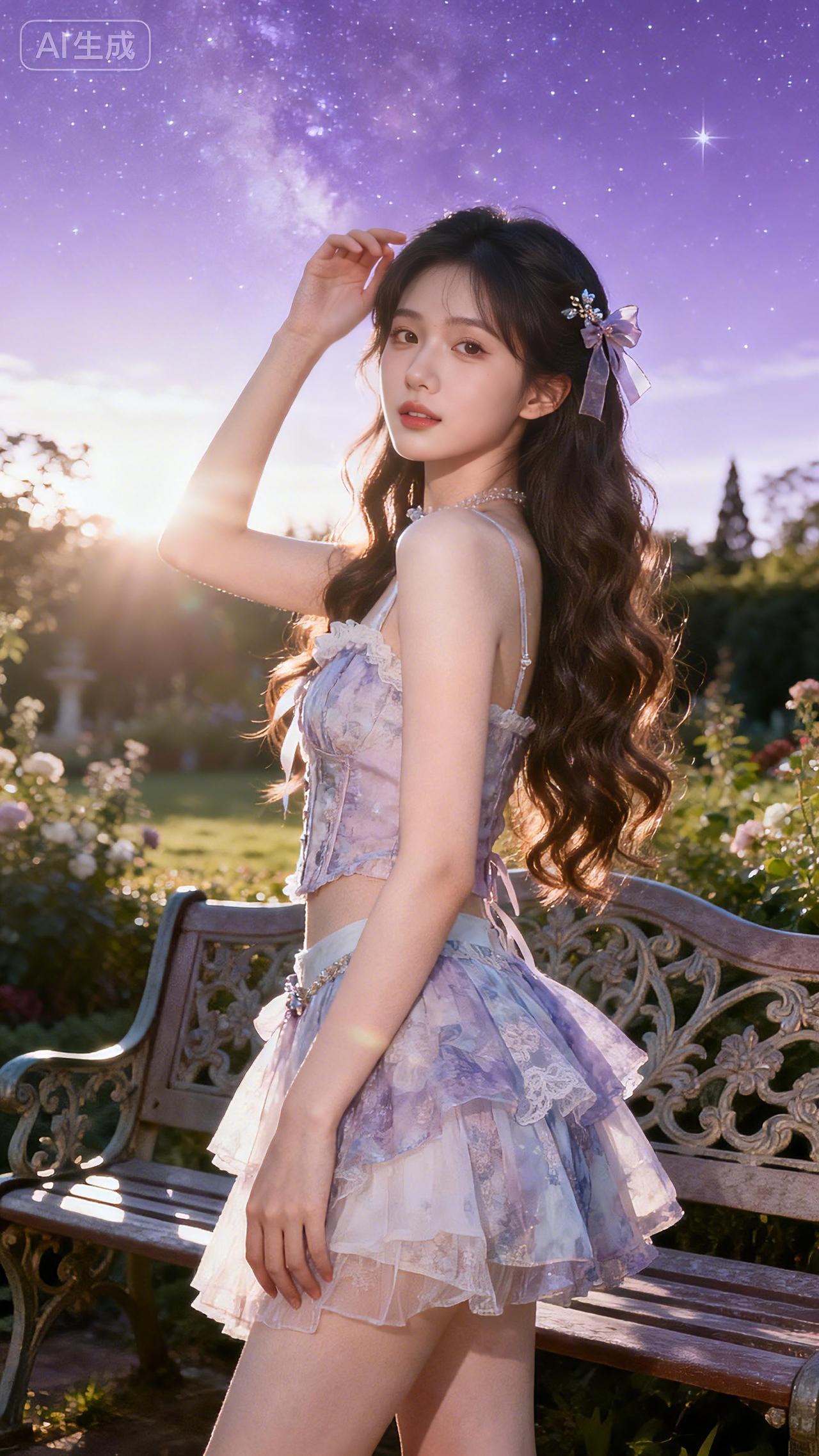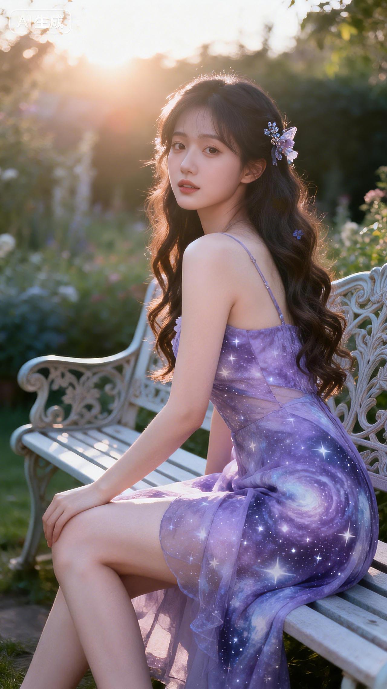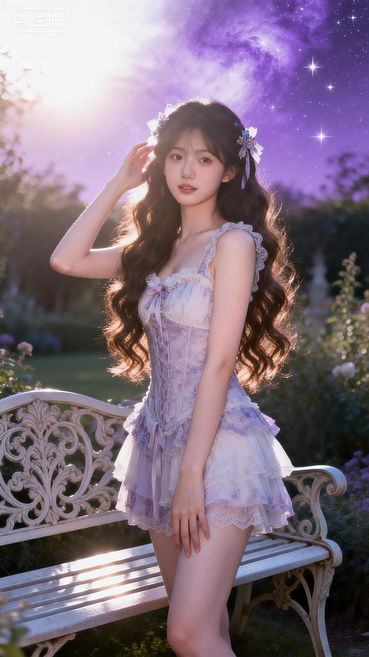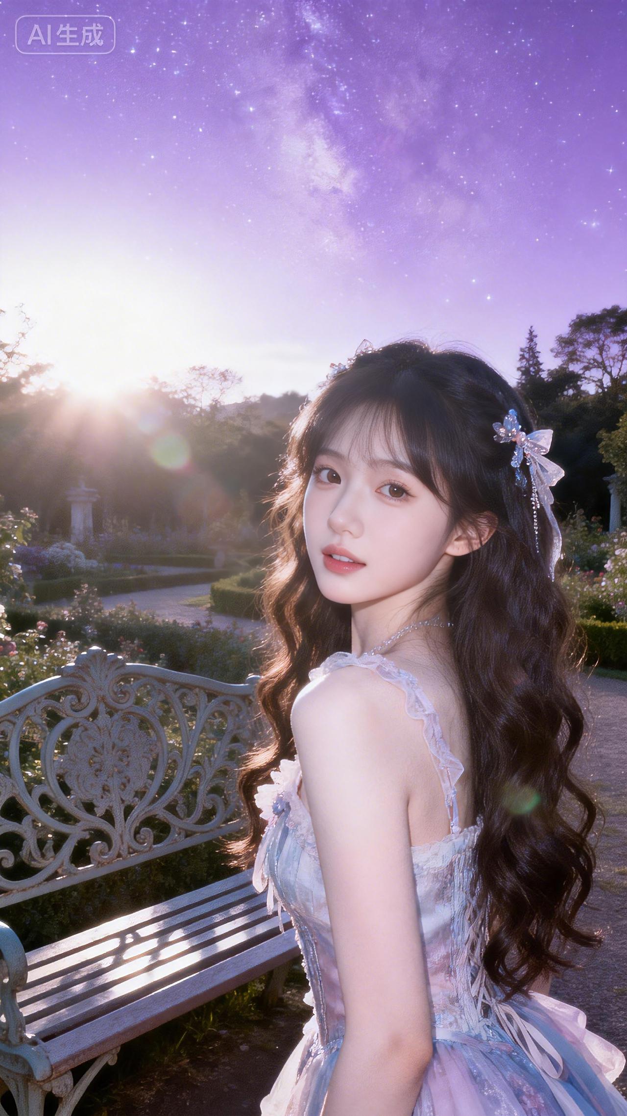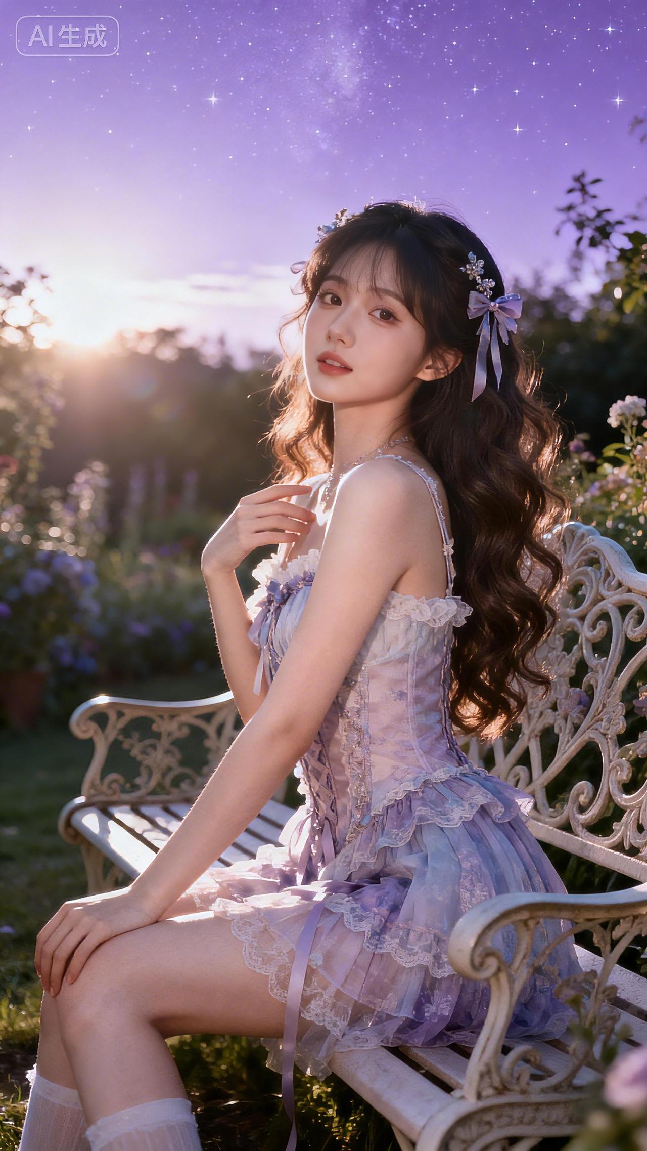 编发少女轻倚藤椅,浅紫纱裙在梦幻花房中随风轻摆。豆包 壁纸