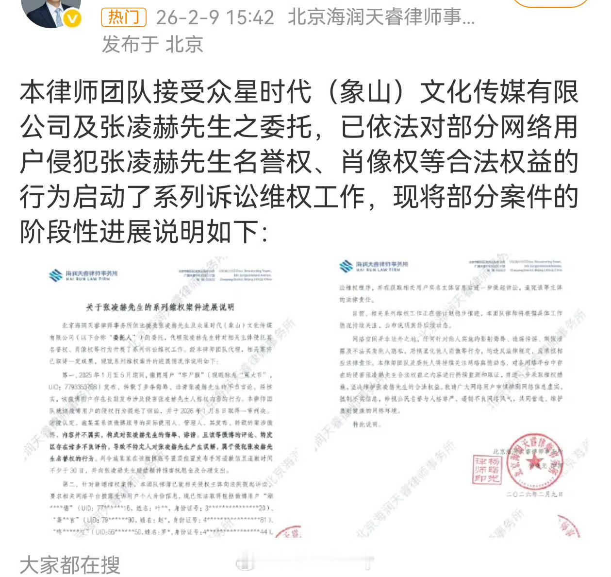 刘大锤回应张凌赫单身张凌赫方发布维权进度