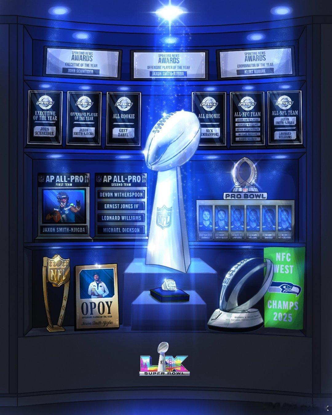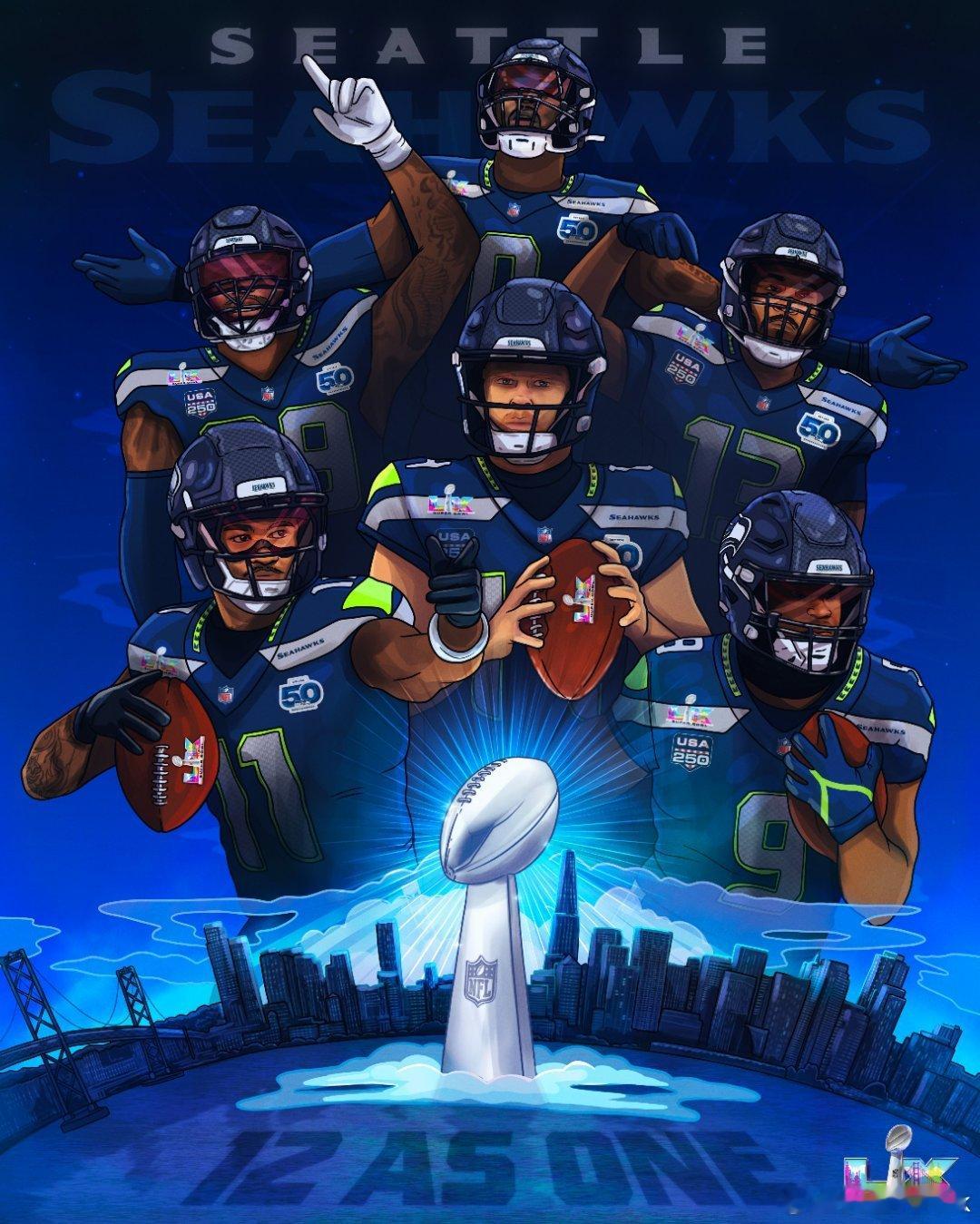 海鹰四分卫萨姆·达诺德38传19中,202码1达阵。跑卫Thunder Shoes肯尼斯·沃克三世荣获MVP,27次跑球135码,上一位在超级碗荣获MVP的跑卫还是在上个世纪,第32届超级碗丹佛野马的特雷尔·戴维斯。外接手库珀·卡普6次接球61码,近端锋AJ 巴纳4次接球54码1达阵。JSN4次接球27码,被对手严加防守,利用他的吸引力也设计了战术。安全卫朱利安·乐福一次抄截。线卫恩沃苏拾到掉球回攻达阵(统计上算int)。
