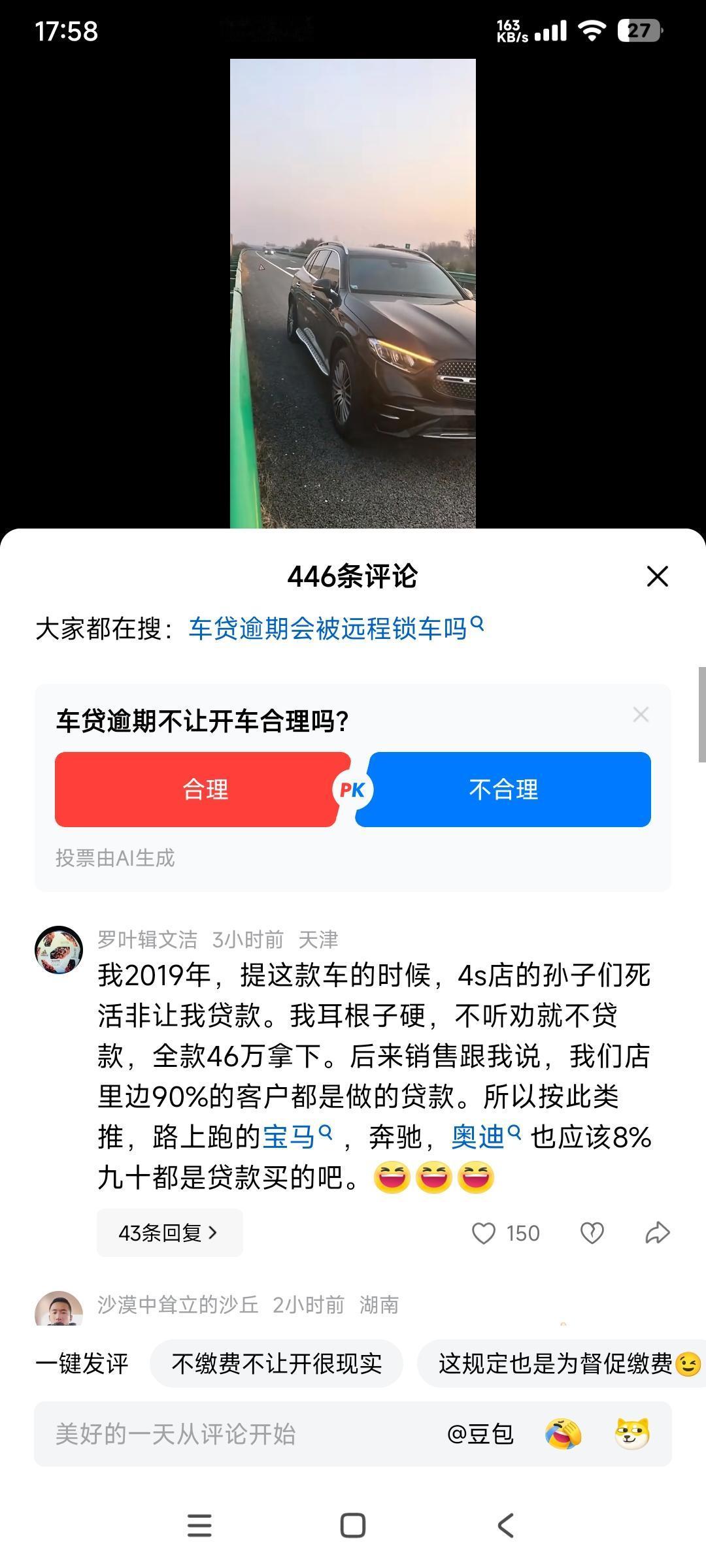 不缴费不让开很现实,可不能等人家下高速再锁车吗? 这位网友在高速上被锁车了,一家老小被落在高速上。锁车来的很突然,他们连应急车道都停不进去。 看他说的原因是车贷逾期被锁的车。欠钱锁车可以理解,但不能没有温度。 提个小小建议,要锁车时定位一下,车子如果在高速上,给车主发个短信或是打个电话提醒一下。让他下高速或是进服务站。 像这位车主突然被锁车,车子停在路中央。万一发生事故谁来负责。