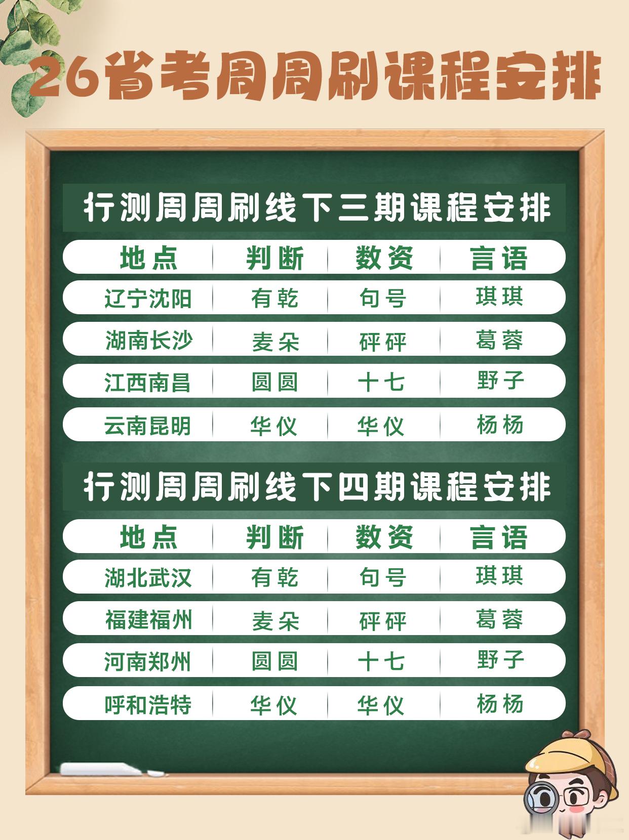 26省考线下笔试套题“周周刷”,3.4期授课师资安排公布三期开课城市:辽宁沈阳(120题)、湖南长沙(120题)、江西南昌(135题)、云南昆明(110题)三期开课时间:2月23号——3月1号(7天6晚,12套行测)四期开课城市:河南郑州(120题)、内蒙古呼和浩特(125题)、湖北武汉(125题)、福建福州(120题)四期开课时间:3月2号——3月8号(7天6晚,12套行测)省考周周刷