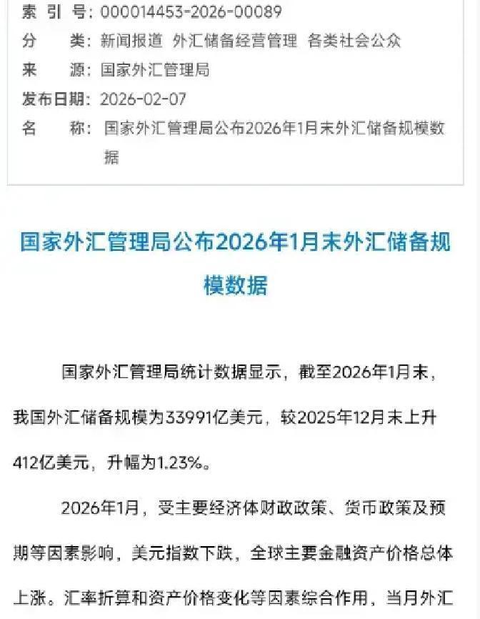 2026年2月7日,北京消息,中国央行最新公布,1月末黄金储备达到7419万盎司,比上月末多了4万盎司,这已经是连续15个月在买黄金了! 就算国际金价1月像过山车一样猛涨猛跌,甚至一度冲破5000美元大关又回调,央行还是稳稳地小步增持,没停手。2025年全年加了86万盎司,之前还暂停过一阵子,从2024年11月重新开始买,现在已经连增15个月。 增持量虽然连续11个月偏低,但这恰恰说明央行很理性:在金价高位不贪多,控制成本的同时优化储备结构。目前黄金在我国国际储备里占比约9.7%,比全球平均15%低不少,继续买黄金就是为了分散风险、提升抗压能力。 外汇储备方面,1月末规模到33991亿美元,环比涨了412亿,升1.23%,连续6个月稳在3.3万亿以上。美元走弱、全球资产价格上涨,加上我国经济韧性强、外贸出口强劲,这些都给储备规模撑腰。 央行这波操作就是在乱局中求稳。地缘风险高、货币政策变数大,黄金作为硬通货,能帮主权货币加信用,也为人民币走出去铺路。哪怕短期金价晃荡,长期看增持黄金的方向不会变,聪明地小步走才最靠谱。