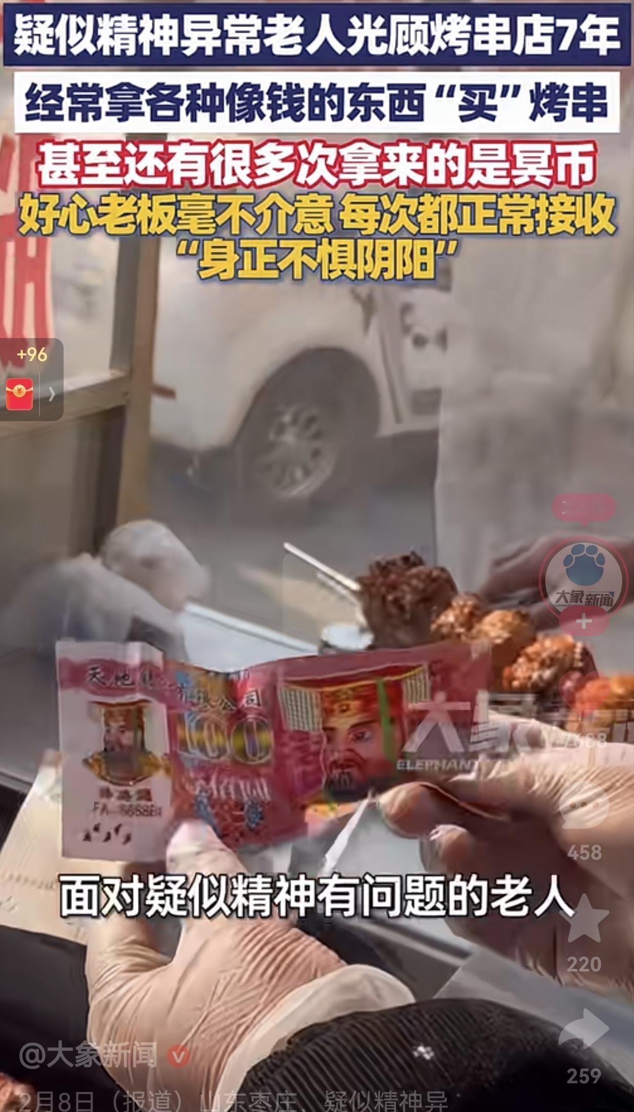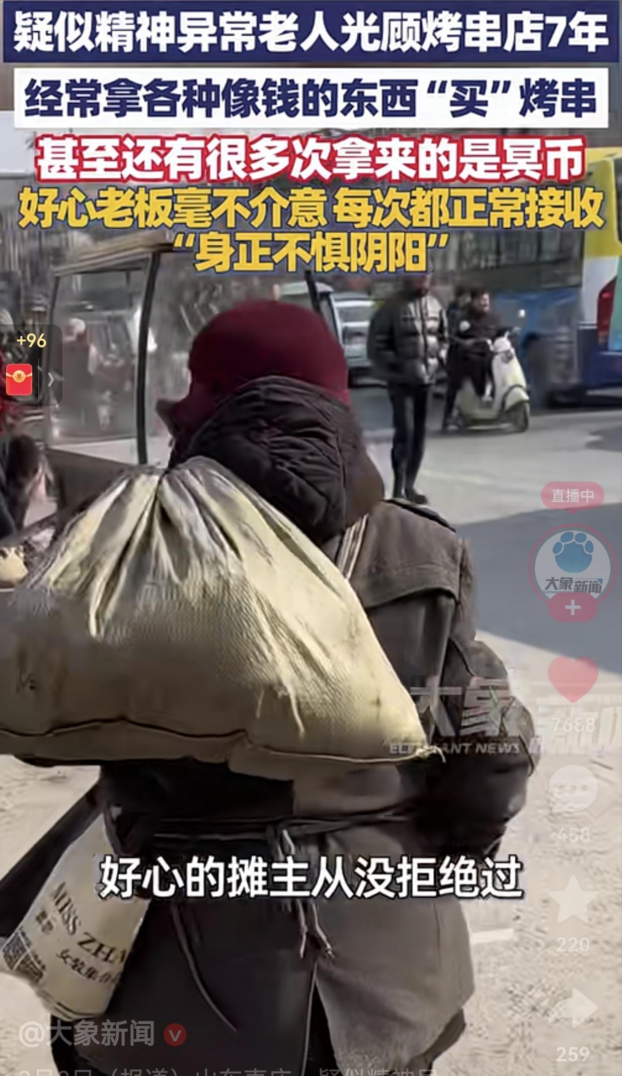 看哭了!这老板太善良了!在山东枣庄的一个镇上,有位头发花白的老奶奶,几乎每天都会准时出现在一家烤串摊前。 每当她出现的时候,她总是背着一个鼓鼓囊囊的旧布包,穿着洗得发白的厚棉衣,脚步蹒跚地走到摊前,从包里掏出几张“钱”递过去。 有时候这个钱是印着卡通图案的儿童玩具币,有时候是印着玉皇大帝的冥币,还有些时候是看起来像钱的塑料卡片,甚至只是一张画着圆圈的硬纸板。 可老板呢?不仅没有拒绝,反而笑着接过来,把烤得焦香流油的肉串用牛皮纸包好,再装进干净的塑料袋里,双手递到她手里,这一善意的举动,整整持续了7年的时间。 有人问他:“你就不怕晦气吗?”老板只是淡淡地说了句:“身正不惧阴阳。” 这话听着简单,背后却是7年如一日的善良。 我想他不是不知道那是冥币,也不是不怕忌讳,只是看着老人小心翼翼递钱的样子,看着她接过烤串时满足的笑容,实在不忍心拒绝。 他说:“让她白拿几串也没啥,可我要是不收她的‘钱’,她该多难受啊。”在他眼里,这不是生意,是给一个孤独的老人留着的体面。 此视频传到了网上,引发无数网友的热议,有的网友说:“看完直接泪目了,这才是真正的善良,不是可怜她,是尊重她。” 还有的网友说:“跑了十几年车,见过太多冷暖,这老板让我相信,好人还是多。” 我们总说“善良是一种选择”,但真正的善良,是在没人看见的时候,依然选择温暖。这个老板用7年的时间,守住了一份最朴素的温柔。 他收下的不是冥币,是一个老人仅有的尊严。递出的也不是烤串,是这个冬天里最暖的光。 我们总在抱怨人情冷漠,却忘了温暖往往就藏在这些不起眼的小事里。一个烤串,7年陪伴,老板用行动告诉我们:真正的体面,不是你有多成功,而是你愿意为别人留多少余地。 我们每天都在忙忙碌碌,忙着赚钱,忙着赶路,却常常忽略了身边那些需要被温柔对待的人。也许我们没法像这个老板一样坚持7年,但我们可以从今天起,给身边的人多一点耐心,多一点微笑。 毕竟,生而为人,我们能给世界最好的礼物,就是在力所能及的情况下,给别人善良。