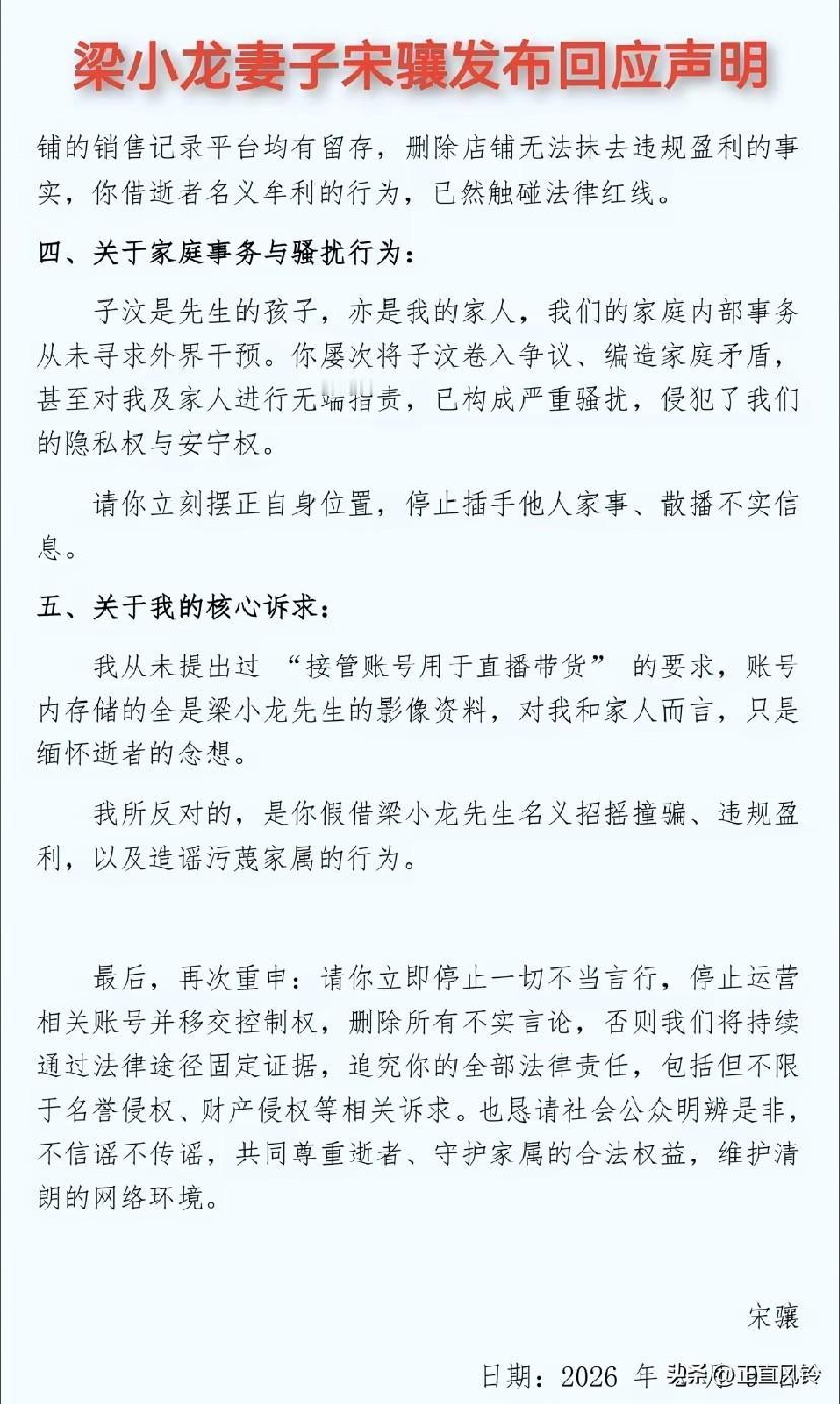 师父梁小龙妻子宋骧师母发布回应声明! 人家只要没离婚,哪里轮到一个外人抢夺账号 不能欺负陈真的演员梁小龙的妻子,欺负女人算什么男人。梁先生肯定不希望自己的账号被用作商用,梁先生的人品所有网友都可作证。标哥已经说了,有部分假徒弟有着不可告人的目的 最痛恨弄虚作假,不管目的如何,属于梁小龙的影音视频资料只有合法继承人才能拥有处置权限。