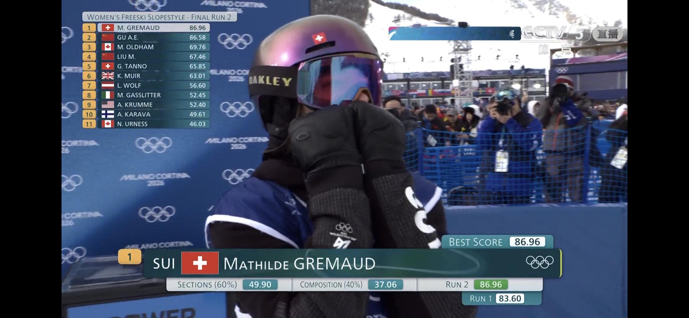 格雷莫德第二滑86.96分反超谷爱凌86.58,0.38分的差距,竞争好激烈
