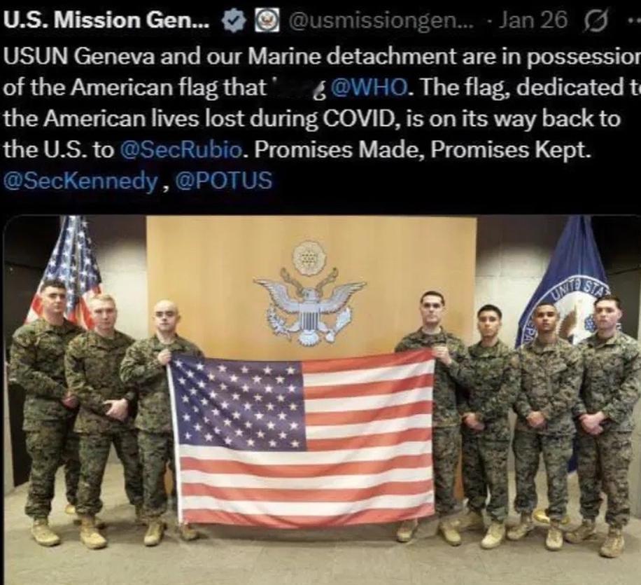 能奈我何,对美国别说国际法也别提联合国宪章… 美国正式退出世界卫生组织后,世卫组织拒绝降下并归还悬挂在其门前的美国国旗,要求美国补交齐所欠的会费后才能归还。于是美国派出在瑞士的海军陆战队士兵直接去现场夺回了这面美国国旗。 事后美国驻联合国大使、驻日内瓦世卫办事处还大大方方证实消息,一点不觉得羞耻,反而摆出一副“我有理”的架势…