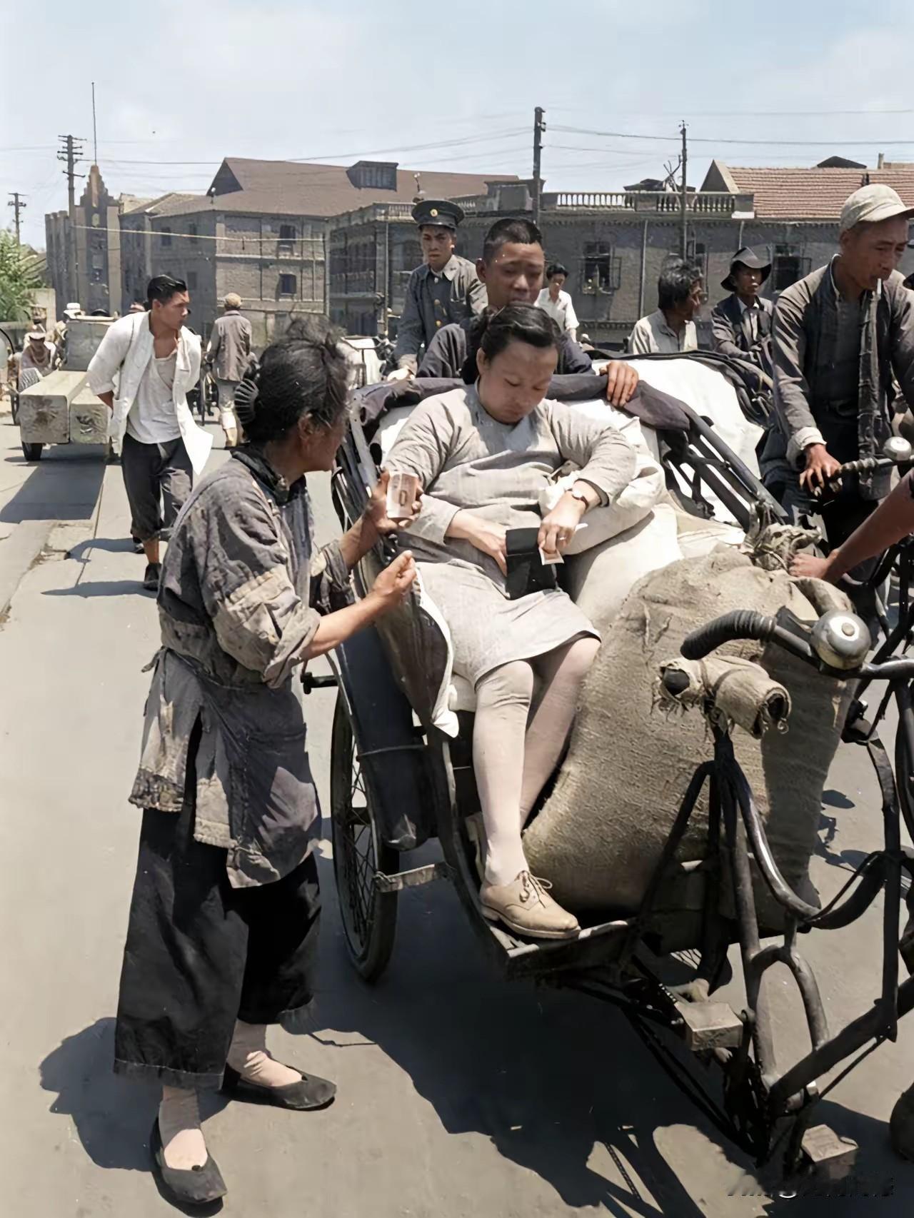 过去的穷苦人,看着真是够穷苦的了,穿的衣服全是补丁,现在人根本就没有看过这样的衣服,更不要说穿这样的衣服了,这个老太太穿的是一双布鞋,脚应该是没有裹过脚,这就是天足,在那个时代,能有这样的脚已经是不容易的事情了。那时候的富人,生活条件虽然好一些,但是穿的衣服也很朴素,能够做车夫拉的车,相当于现在坐高档轿车了!