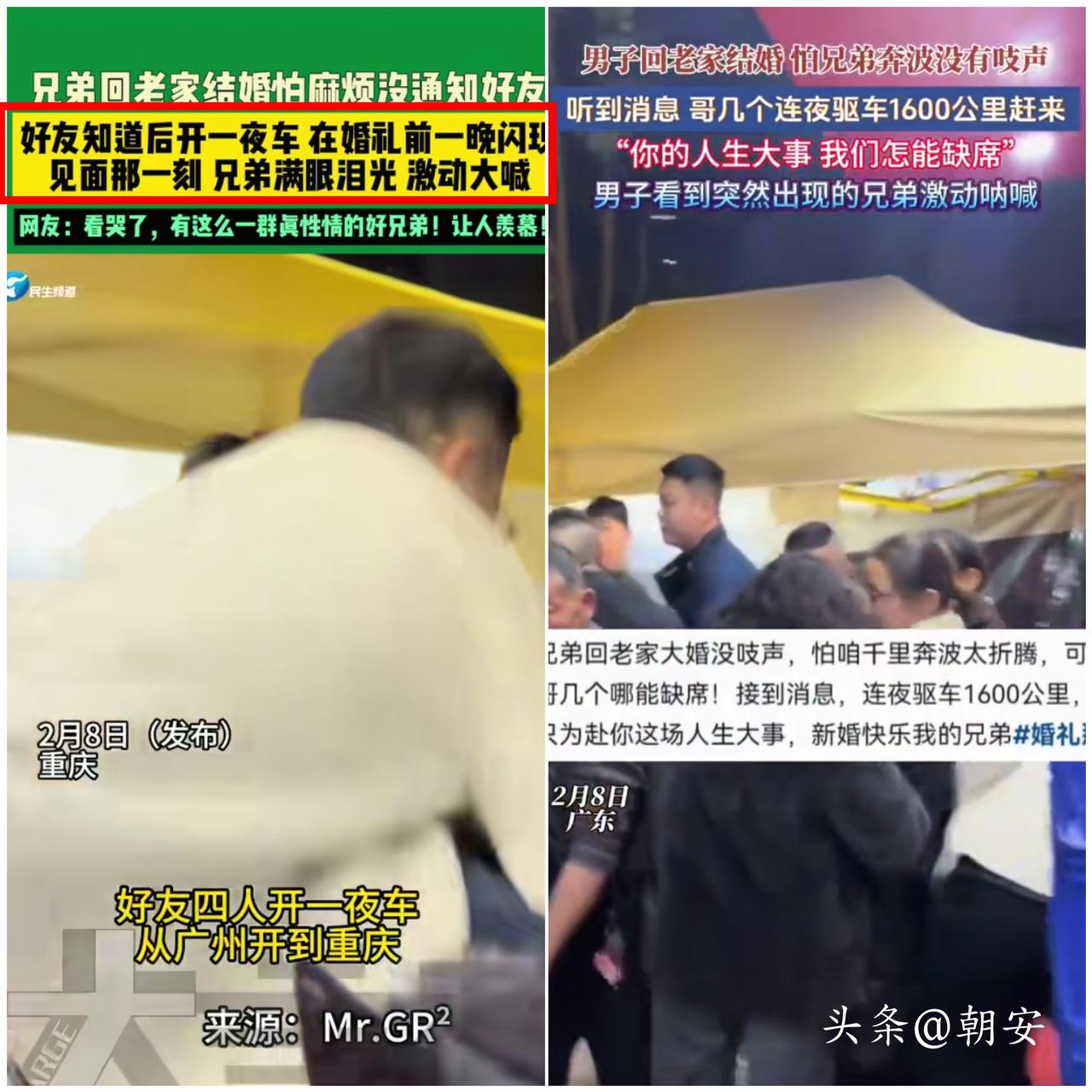 看哭了! 重庆男子结婚怕麻烦好友没通知,兄弟竟驱车1600公里连夜赶到,见面瞬间直接破防,这才是成年人最珍贵的情义。 他体谅大家奔波不易,想悄悄完成人生大事,不想给任何人添负担。 可真正的朋友从不怕麻烦,得知消息后立刻出发,轮流开车、昼夜兼程,只为不错过他最重要的时刻。 没有提前报备,没有华丽铺垫,突然出现的身影,比任何祝福都更戳心。 长大后我们总说忙碌疏远了关系,可这场千里奔赴告诉我们,真心从不受距离限制,最好的友情是各自忙碌、又彼此牵挂,关键时刻永远都在。 你身边有没有这种不远千里也要为你而来的真朋友?