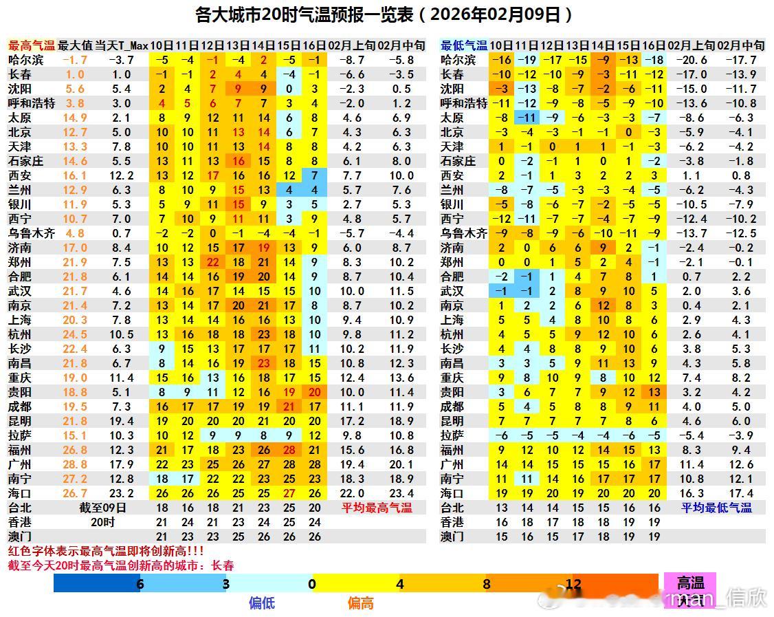 12-14日期间,气温可能创新高的有:哈尔滨2℃(今年首次上0℃)、长春4℃、沈阳9℃、呼和浩特7℃、北京14℃、天津14℃、兰州15℃、银川15℃、石家庄16℃(这三个都是今年首次上15℃)、济南19℃、郑州22℃、南昌23℃。中东部15-16日降温之后,可能有还有回升,但过年以后,可能还有冷空气。