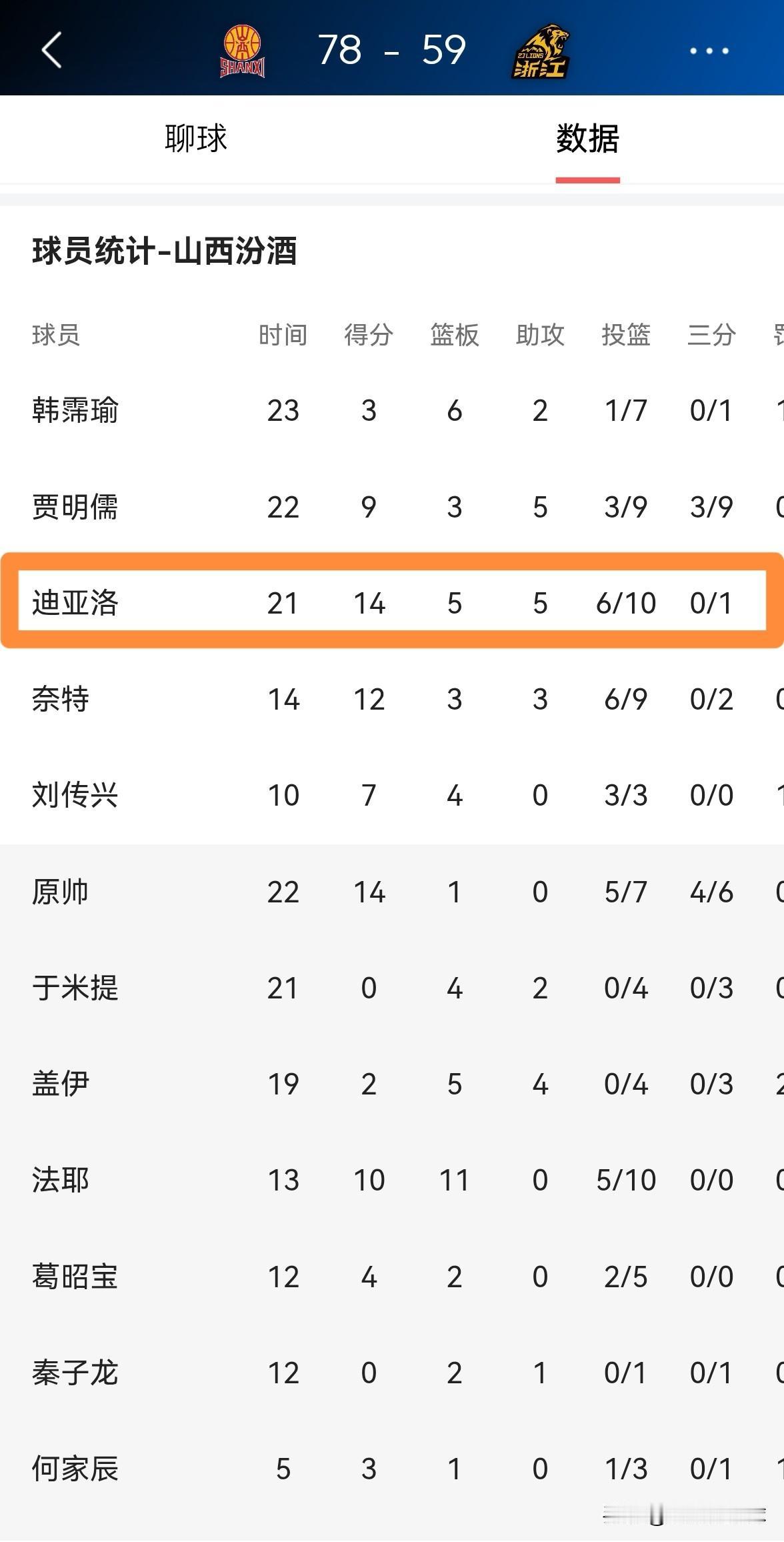 山西汾酒外援迪亚洛真是太懂事了!在今天山西汾酒以78:59大胜浙江方兴渡的CBA俱乐部杯半决赛中,迪亚洛深知对手缺兵少将,因此他在比赛中完全没有全力以赴,不然的话浙江方兴渡会输的更惨。 全场比赛下来,迪亚洛首发出战21分钟,投篮10中6,其中三分球1中0、罚球4中2仅仅得到14分。 从迪亚洛在本场比赛中的表现来看,他是攒着劲准备大战上海久事超级外援洛夫顿了。