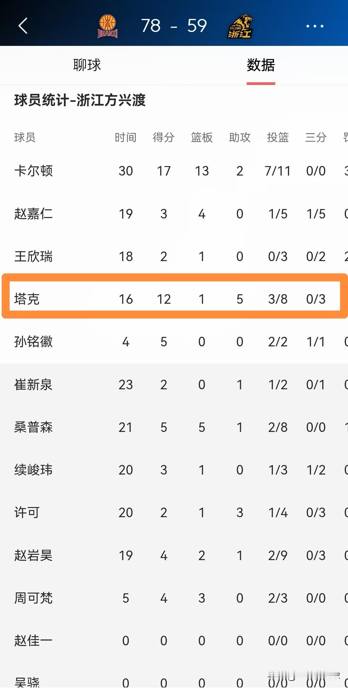 我忍不住要怒批浙江方兴渡外援塔克!在今天浙江方兴渡以59:78惨败于山西汾酒的比赛中,塔克在比赛中如同梦游一般失误频频,完全没有打出球队核心的表现。 整场比赛下来,塔克首发出战16分钟,投篮8中3,其中三分球3中0、罚球7中6得到12分,还有3次失误和2次犯规,他的场上正负值为-11。 尤其是在孙铭徽因伤提前退赛以后,塔克完全没有将球队抗在肩上,最终引发了一场血淋淋的惨败。