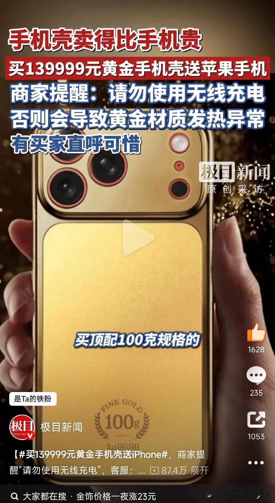 13万9买个手机壳送手机? 真是贫穷限制了我的想象力! 以前我们学“买椟还珠”觉得那人傻,现在看来,是我们格局小了! 某电商平台搞了个大动作,推出了一款“黄金手机壳”,最高规格的卖到了139,999元!你没看错,是13万9千9百9十9块!这价格,买个豪车首付都够了,或者买几十台iPhone了。 结果商家说:买这个手机壳,送一部iPhone 17 Pro Max!这不就是妥妥的“卖椟送珠”吗?以前是人傻钱多,现在是商家比买家还豪横? 更绝的是使用说明书:请勿使用无线充电! 为啥?因为这壳子里嵌了100g的真金片(Au99.99)!金子导电啊,你要是搁无线充电板上,那不是充电,那是“短路”!不仅充不进电,手机可能还得烧了。这哪是买手机壳,分明是买了一块移动的“金砖”揣兜里。 适合人群分析: 钱多没处花的:现金太多,急需找个理由把资产变成随身携带的金属。 硬核炫富的:别人拿手机看屏幕,你拿手机看含金量。别人问你手机多少钱,你说“手机也就送的,壳子值钱”。 黄金收藏家:主打一个“投资属性”,这叫随身携带的固定资产。 目前这13万多的顶配版已经卖了55件了!看来这世上真的不缺有钱人,也不缺把黄金焊在手机壳上的脑洞。 咱就是说,这手机壳要是丢了,报警得按抢劫金库立案吧?这心理压力,恐怕比手机本身还重。 大家来聊聊: 如果你有14万,你会买这个“金砖壳”吗? 这种手机壳,算不算当代版的“买椟还珠”?