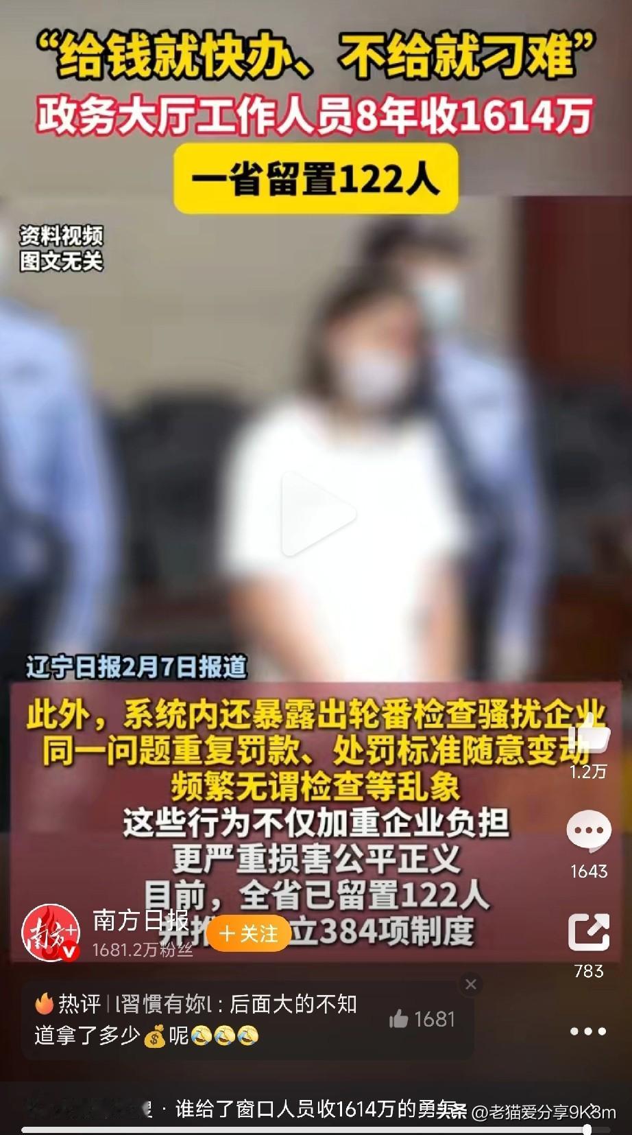 政务窗变“提款机”? 8年狂捞1600万! 辽宁政务大厅一窗口人员,8年时间愣是搞了1614万!平均一天进账5万多,这哪是办事窗口,简直是把他家收款码贴玻璃上了! 不送钱?对不起,材料不全,领导不在,系统坏了……各种理由给你拖到怀疑人生!送了钱?好说好说,今天送件今天办,VIP待遇给你安排得明明白白!这哪里是为人民服务,分明是把公家权力当成了自家的“摇钱树”,吃相太难看了! 咱就是说,这“小鬼”哪来的天大胆子?8年啊!整整8年!这期间就没个监管部门发现点啥?就没个办事群众投诉点啥?这“硕鼠”能养得这么肥,到底是监管“睡着了”,还是有人睁一只眼闭一只眼?这背后的“保护伞”到底是谁? 这事最恶心人的,不是钱多,是这种“看人下菜碟”的恶心劲!营商环境要是被这种“蛀虫”毁了,谁还敢来投资?谁还敢来办事?老百姓的信任,就是被这种“小鬼”一点点啃没的! 现在人抓了,钱追了,但这事不能就这么完了。必须得深挖:他是怎么躲过8年监管的?制度漏洞到底在哪?除了他,还有没有“李某某”“张某某”在别的窗口“营业”? 支持严查到底,别让“微权力”变成“大贪腐”! (文章素材来自南方日报,侵删)