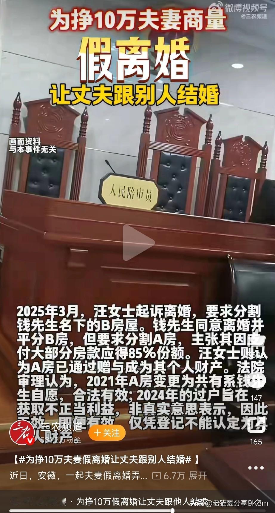 假离婚套补偿,人财两空! 安徽一对夫妻为套取10万拆迁补偿,上演“假离婚”大戏,结果赔了夫人又折兵,房子差点没守住,补偿款还得倒贴!简直了,把婚姻当儿戏,把法律当摆设,这波操作太离谱! 剧情回顾: 汪女士和钱先生原是夫妻。2021年,男方把婚前买的A房加了女方名字。2024年,为挣10万“酬谢”,两人计划“假离婚”,让男方和第三人结婚骗拆迁款。A房过户到汪女士名下,离婚申请都提交了。结果计划黄了,离婚没离成,房子却过不了户。后来真闹离婚打官司,B房平分,A房判归汪女士,但她得补偿男方一半房款!最后,汪女士倒贴4万补偿款,竹篮打水一场空! 说好的“假离婚”呢?法律不认这戏码!只要办了手续,婚姻真没了! 房子过户是为骗补偿?非真实意思表示,赠与无效!想钻空子?门都没有! 房产分割看证据:A房虽登记女方名下,但男方实际出资多,必须补偿! 假离婚=真风险!房产、财产、孩子全可能变天! 别信“复婚包票”,法律只看离婚证! 钻政策空子?小心赔了信誉又坐牢! 原来我们这也有一个女的为了分房子想假离婚,丈夫死活不同意!看来有人清醒,有人还在做梦啊! 假离婚这坑,跳一次就够呛,别等到人财两空才后悔! (文章素材来自三农频道,侵删)