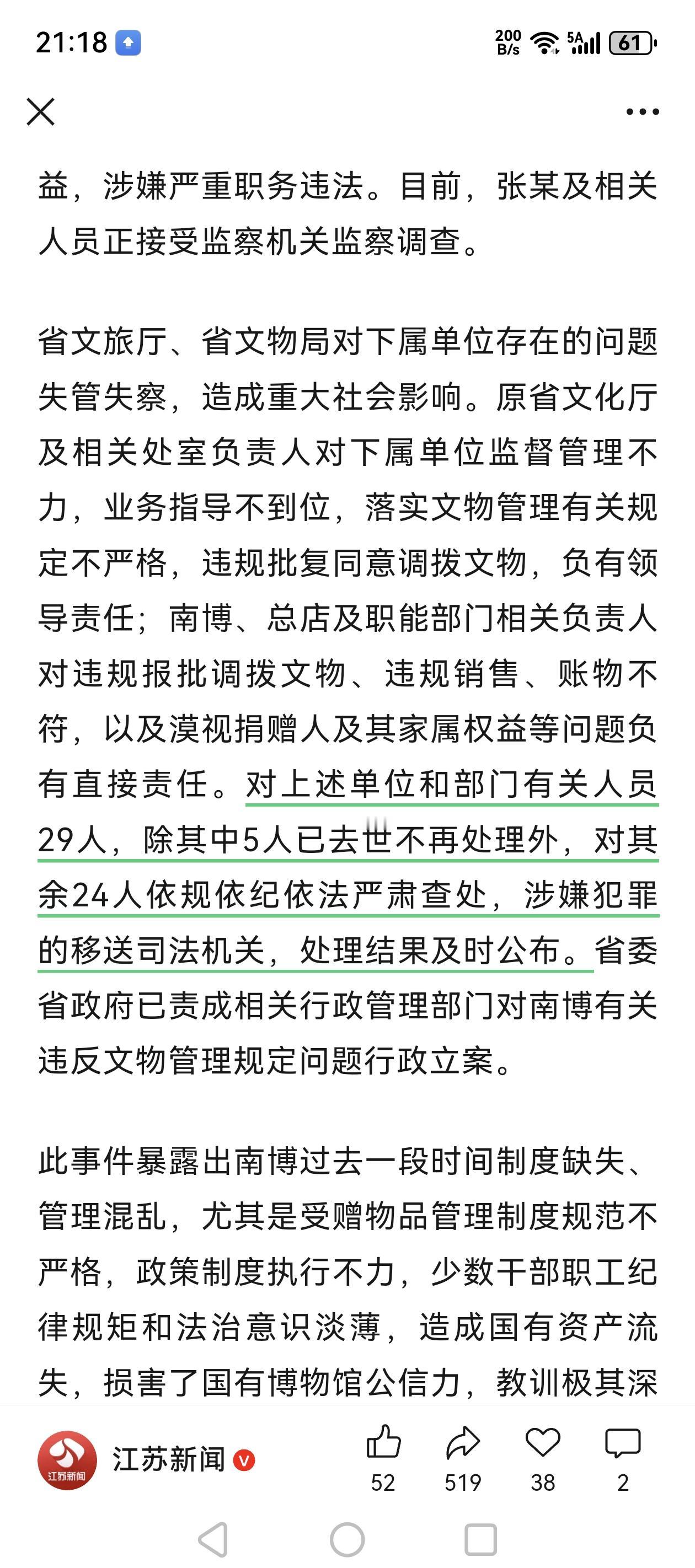 江苏省:南京博物院遗失画作调查报告公布,3幅追回,1幅在馆,1幅下落不明。原院长西湖平被纪委监委立案调查,29名责任人中5人已去世,对另外24人依法依规严肃查处。
