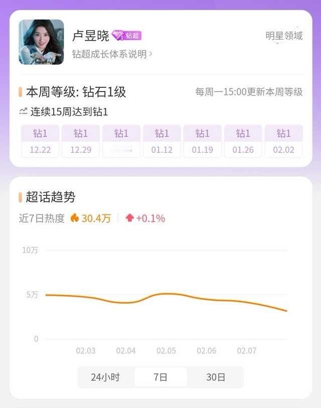 卢昱晓2025年全网涨粉800万➕超like同期花位列第四并且在无任何活动下超话连续15周钻超真有效播剧卢昱晓