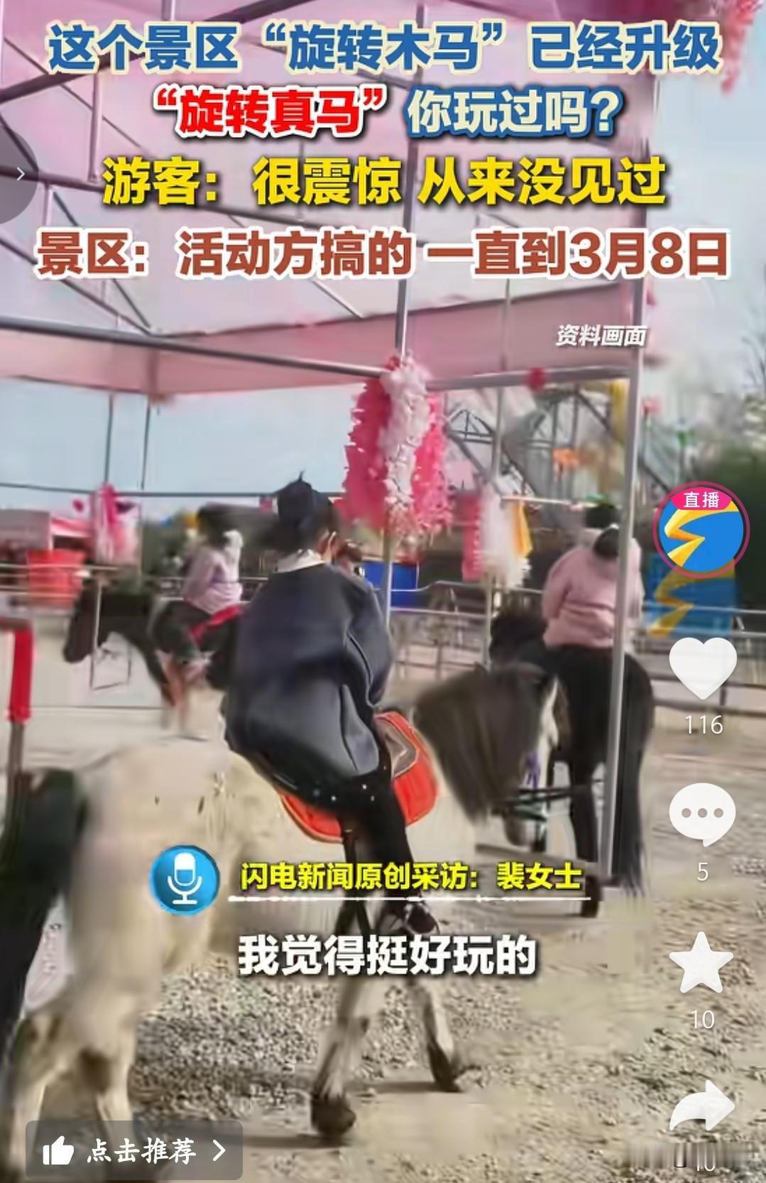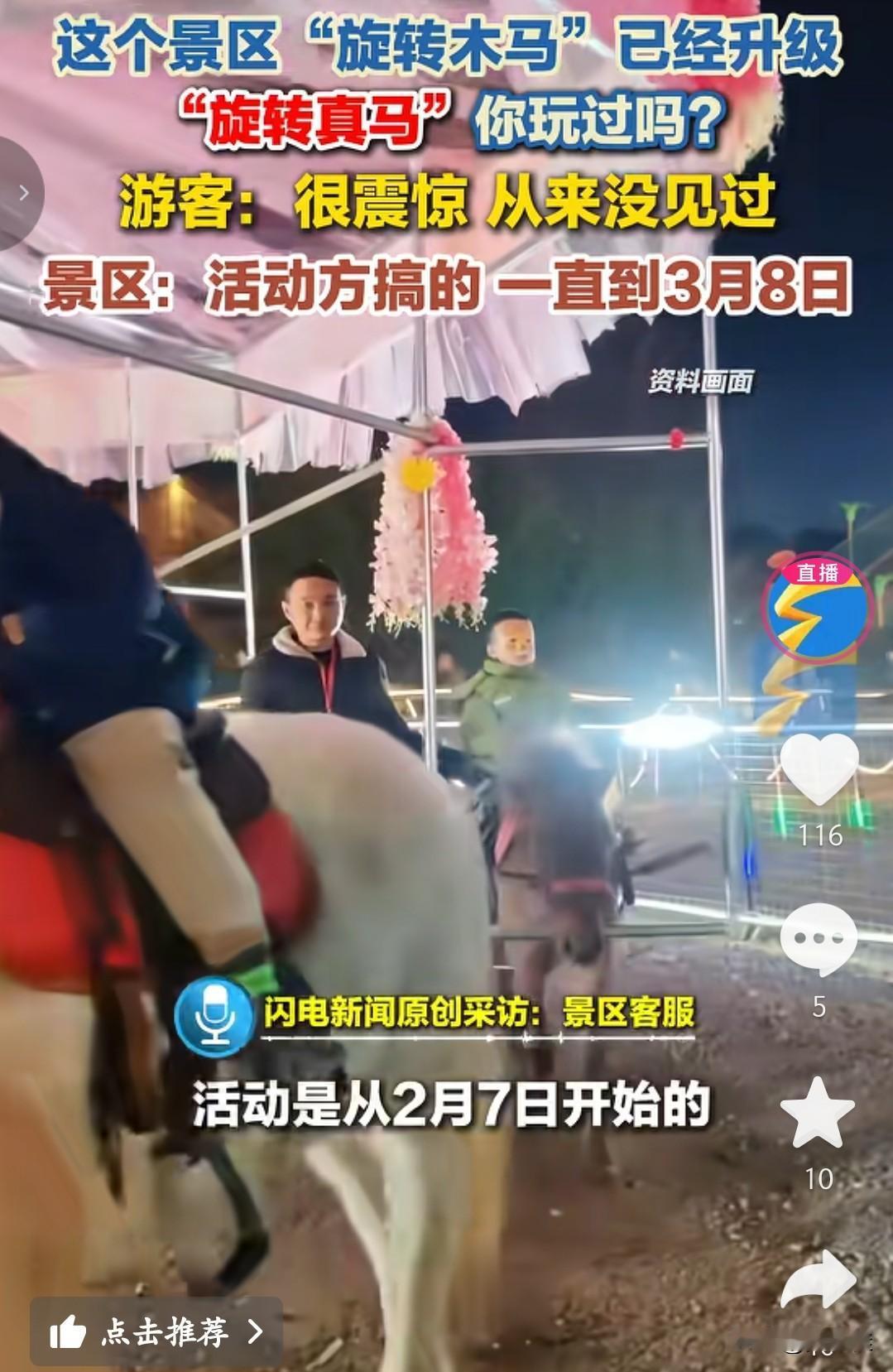 最近有个景区把旋转木马“升级”了,直接换成了真马,游客们都看傻了。活动从2月7日一直持续到3月8日,不少人特意来打卡,都说挺新鲜好玩。 这个“旋转真马”就是把几匹马拴在架子上,跟着机械装置慢慢转圈,游客骑在上面体验。很好奇,这马一圈圈转,会不会被转晕啊? 毕竟马是活物,一直机械转圈,对它们的体力和精神都是考验。这样的项目会不会对马造成伤害,有没有专业人员在旁边照看,也成了大家关心的问题。