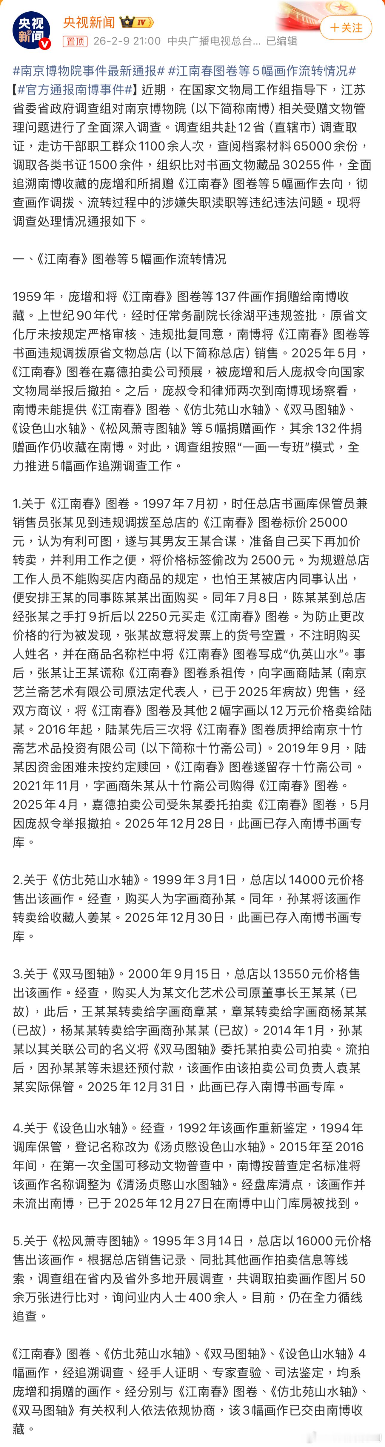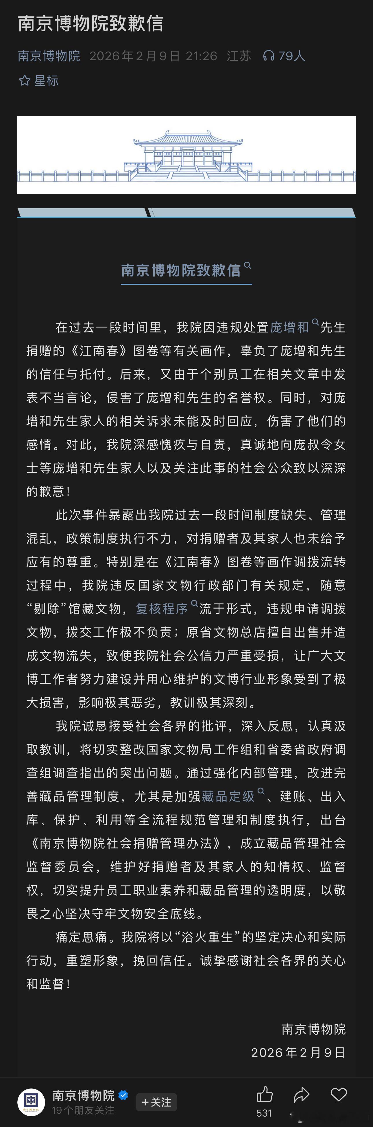 南京博物院事件的官方通报和南博官方发布的致歉信都来了,简单总结就是上梁不正下梁还歪。时任常务副院长徐湖平违规签批,原省文化厅未按规定严格审核、违规批复同意,将馆藏画作违规调拨给省文物总店出售,而省文物总店店员利用职务之便偷改标签,私自以低价买下画作再对外兜售。