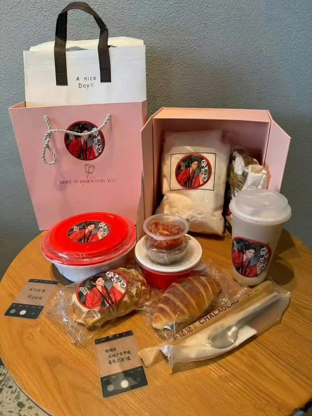 迪丽热巴粉丝逆应援一人份=参鸡汤套餐+奶茶+两个面包+礼盒(含毛绒围巾、安睡裤)