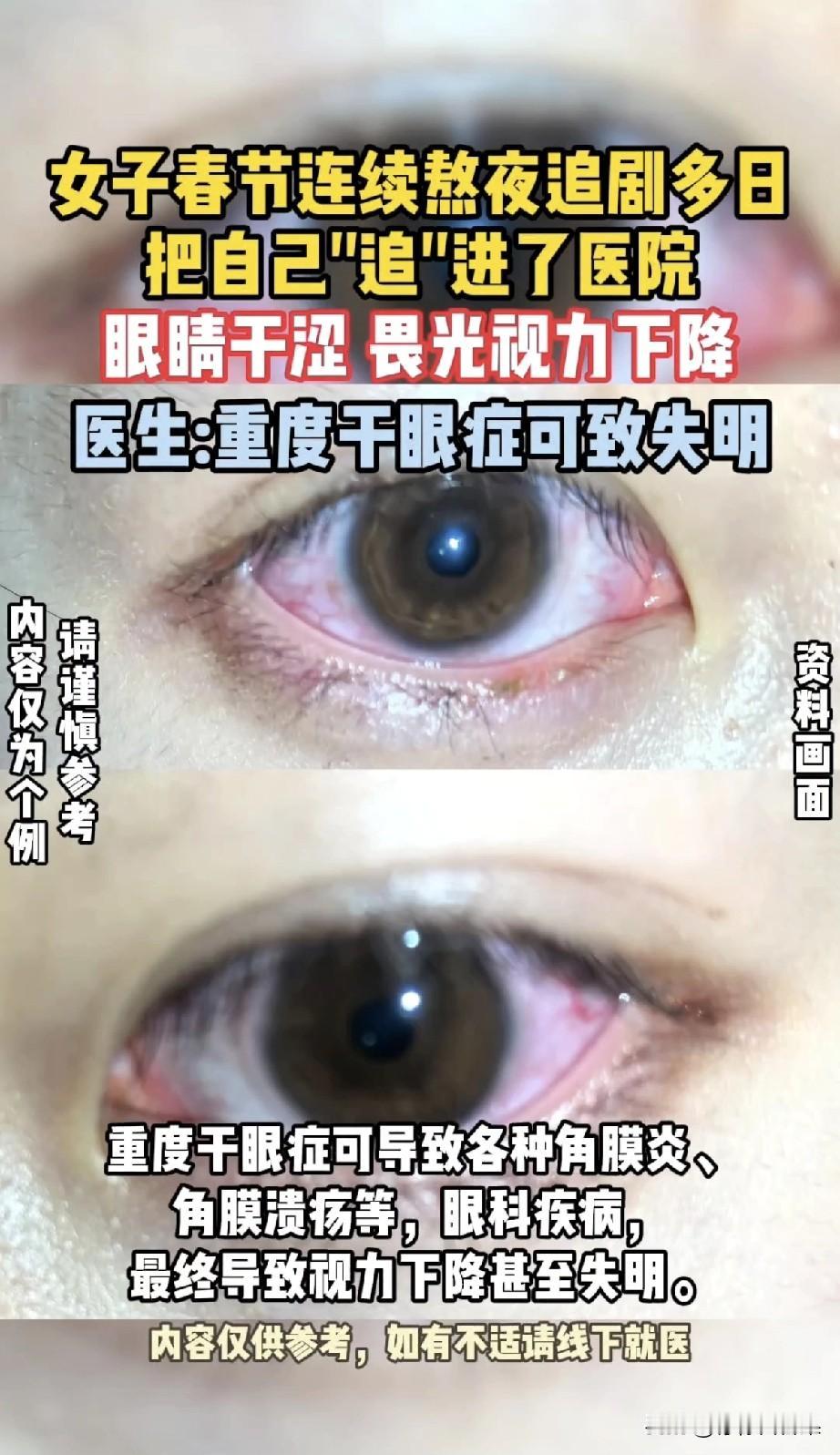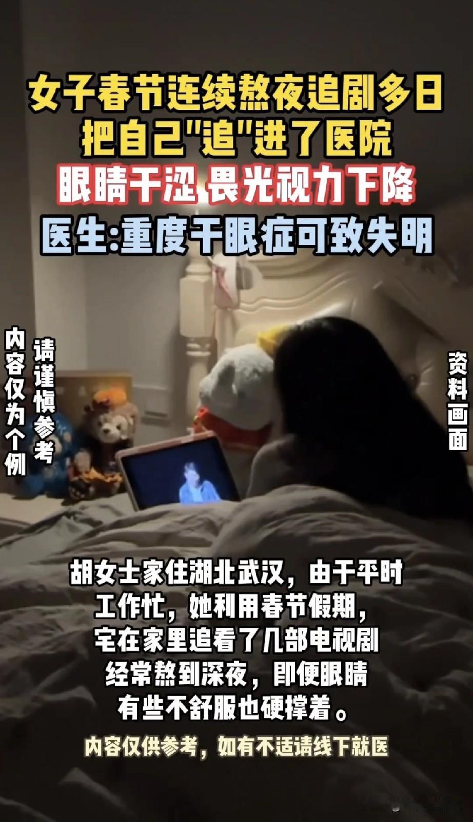 武汉28岁的胡女士,春节期间为了补剧,天天熬到深夜,眼睛干涩、畏光、视力下降,硬是把自己“追”进了医院。 医生检查后确诊为重度干眼症,并警告:长期忽视眼干,可能引发角膜溃疡、穿孔,严重时真的会失明! 现在很多人把“熬夜追剧”当成一种放松方式,但这种“报复性娱乐”其实是在透支健康。眼睛是我们感知世界的窗口,一旦受损,再精彩的剧情也无法弥补。春节假期,与其在屏幕前消耗自己,不如多陪陪家人,或者出门走走,让眼睛和身心都真正地休息一下。