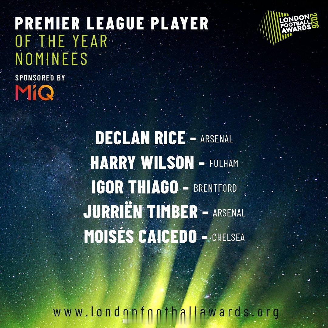 年度最佳英超球员提名名单:赖斯(阿森纳)、哈里·威尔逊(富勒姆)、伊戈尔·蒂亚戈(布伦特福德)、廷伯(阿森纳)、凯塞多(切尔西)