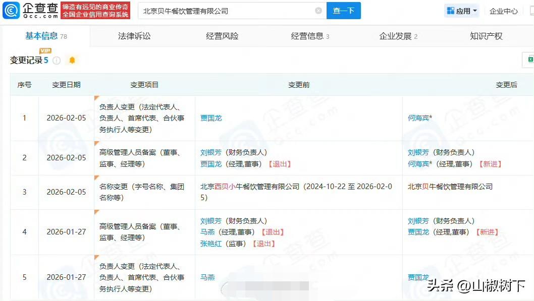 贾国龙卸任卸任西贝小牛法定代表人,公司更名为“贝牛餐饮”,难道贾老板又花钱找高人指点了。 值得一提的是,1月27日,该公司刚刚发生工商变更,贾国龙担任法定代表人、经理、董事,现在任期还不足2周就跑路了,难道是要换个懂事的董事长[笑哭][笑哭]