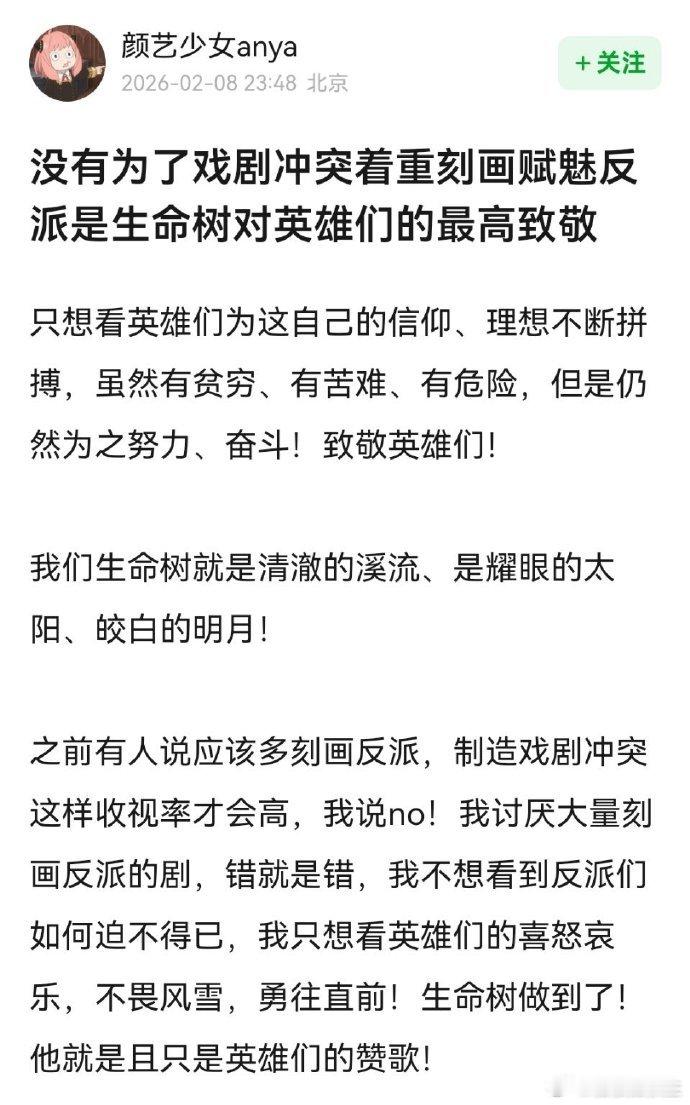 生命树对英雄们的最高致敬谁还没被生命树的格局打动!不刻画反派的“无奈”,只歌颂英雄的坚守,错就是错,对就是对,这种纯粹的叙事,才是对英雄们最高的致敬啊!