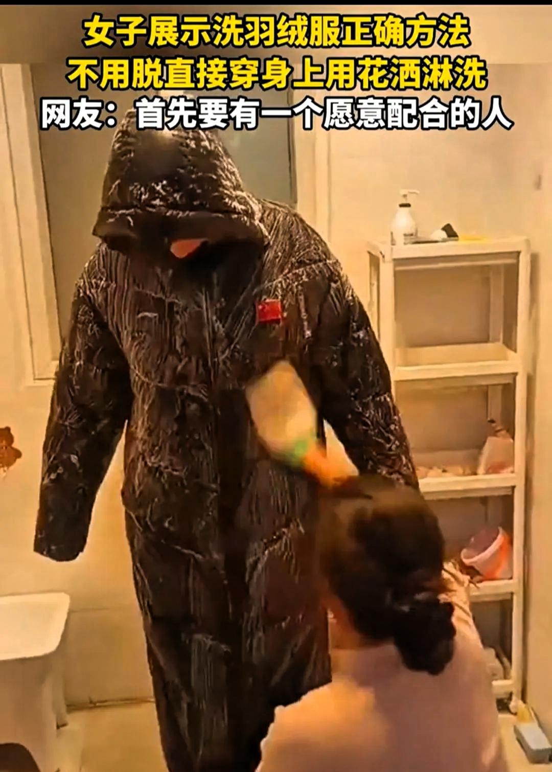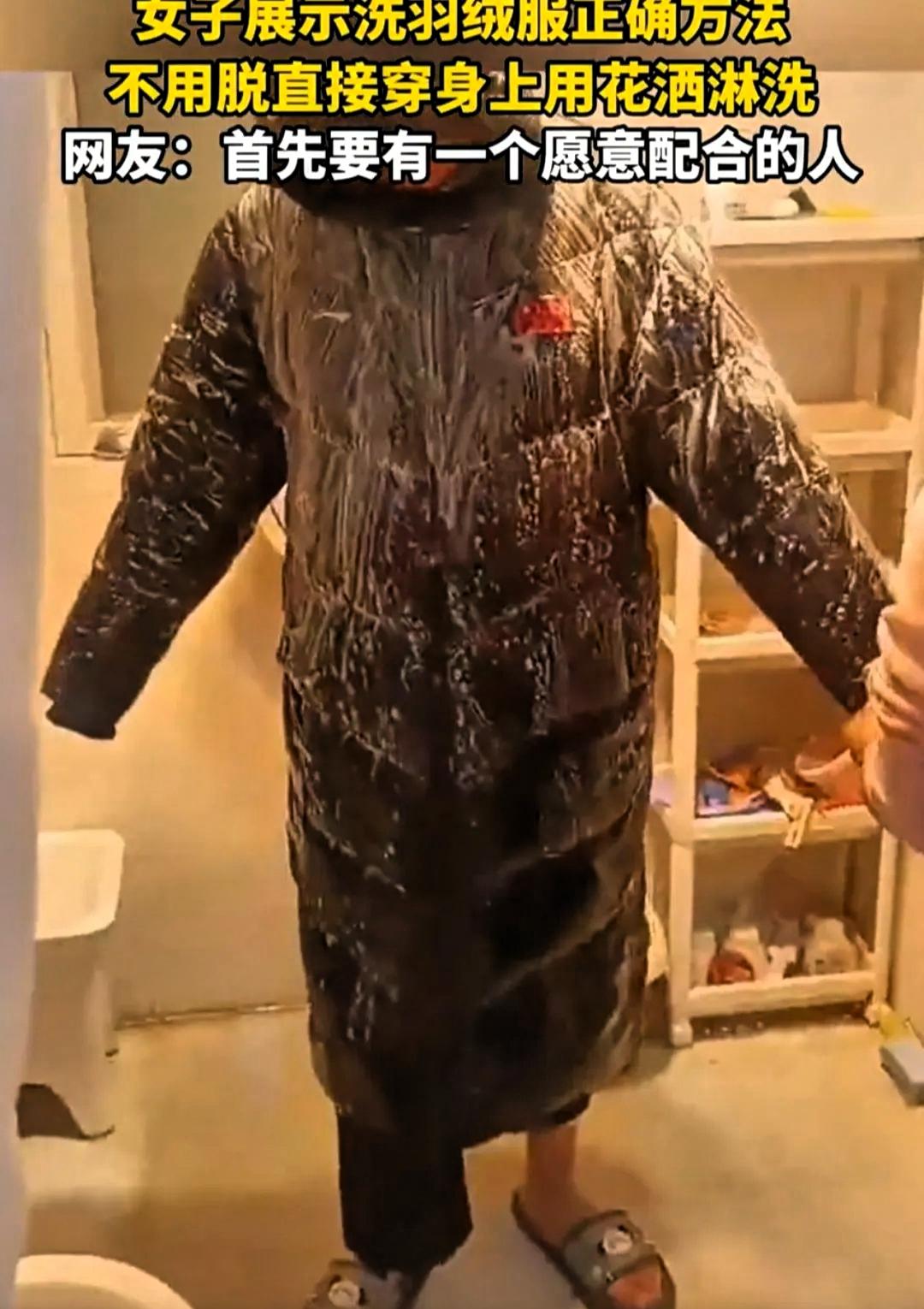 河南,女子过年想把儿子的羽绒服洗一下,洗衣机怕洗坏了,手洗又费劲,她便让儿子穿着羽绒服,用洗澡花洒直接冲洗。视频传开后,评论区意见不一,有人觉得确实省力,也有人理性提醒,这样洗可能达不到效果还伤衣服。 其实这位宝妈的想法很能理解,过年讲究干净整洁,想让孩子穿得清爽走亲访友,这份心思家长们都有。 但客观来说,穿着洗的方式并不推荐。羽绒服吸水后重量会增加,孩子穿着既不舒服,也不利于身体舒展。更关键的是,表面的污渍或许能冲掉,但内里的污垢和洗涤剂很难彻底清理,残留的洗衣液还可能让羽绒结块,时间久了不仅保暖性下降,还容易滋生细菌产生异味。 洗羽绒服没必要走极端,掌握简单的技巧就能兼顾干净和护衣。日常穿的羽绒服大多只有局部脏,用温水加中性洗衣液,用软毛刷轻刷领口、袖口等部位,清水冲净后擦干,基本就能解决问题。如果确实需要整件洗,机洗时记得拉好拉链、扣好扣子,套上洗衣袋,选择轻柔模式,水温控制在30℃以下。洗完后不要拧绞,轻轻按压出水,平铺阴干,干透后轻轻拍打,羽绒就能恢复蓬松。 过年做家务本就繁琐,选对方法才能真正省力。与其尝试不确定的妙招,不如用稳妥的方式,既保证清洁效果,也能延长衣服寿命。你平时都是怎么洗羽绒服的?