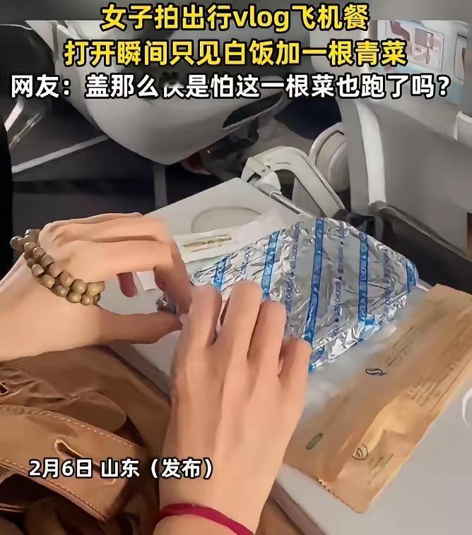 太离谱!山东女子飞机餐惊现“独苗青菜”,慌忙盖盖的一幕笑翻全网,背后真相更值得深思。 本是拍旅行Vlog的随手记录,打开餐盒只看到一碗白饭配一根青菜,换谁都会愣住。后来才知道是双头餐盒设计,只掀开一侧才闹了乌龙,当事人也及时澄清,并非航司只给一根菜。 但这场乌龙能爆火,根本不是摆拍,而是戳中了大家对经济舱餐食敷衍的普遍不满。碎片化镜头容易带偏舆论,可航司也该反思,餐食设计不合理、分量太抠门,才会给误会留空间。 分享生活要完整,服务行业更要用心,别让小疏忽变成大舆情。你遇到过飞机餐很敷衍的情况吗?国航头等舱餐食 航空餐食测评 飞机的餐饮
