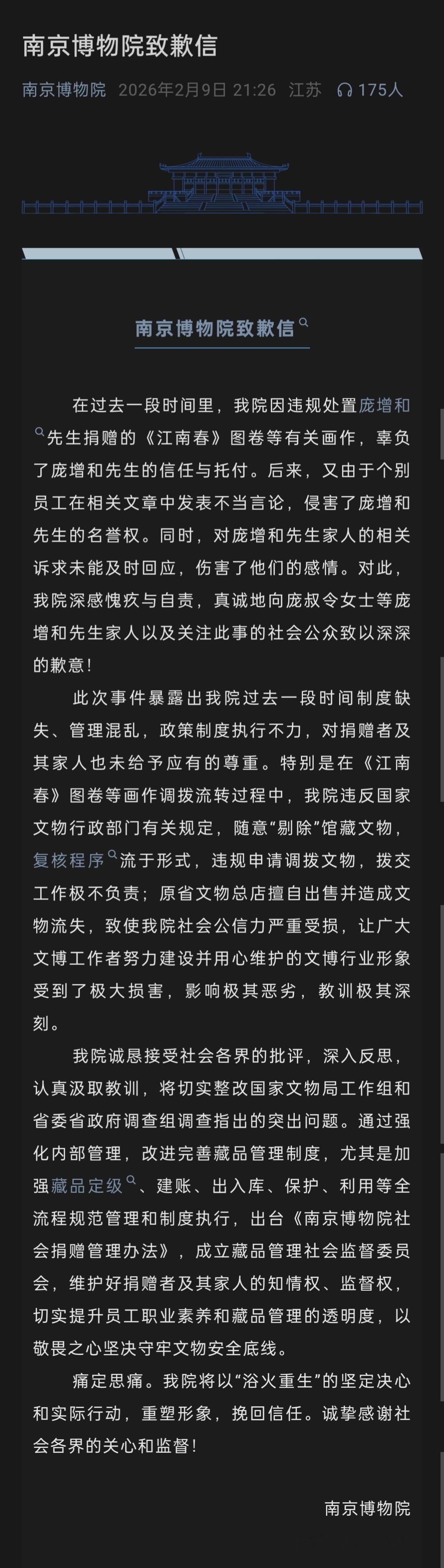🔻这是南京博物院的致歉信。南京博物院事件最新通报