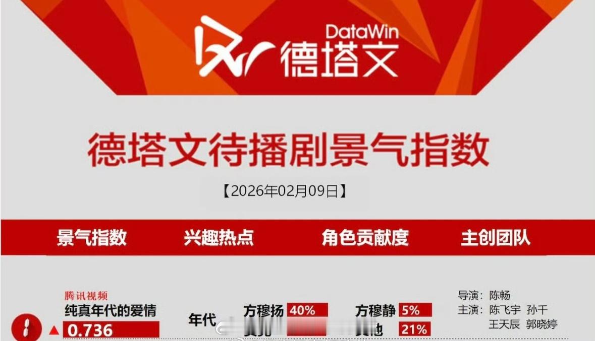 陈飞宇《纯真年代的爱情》登顶德塔文待播剧第一,角色贡献度40%👏👏👏