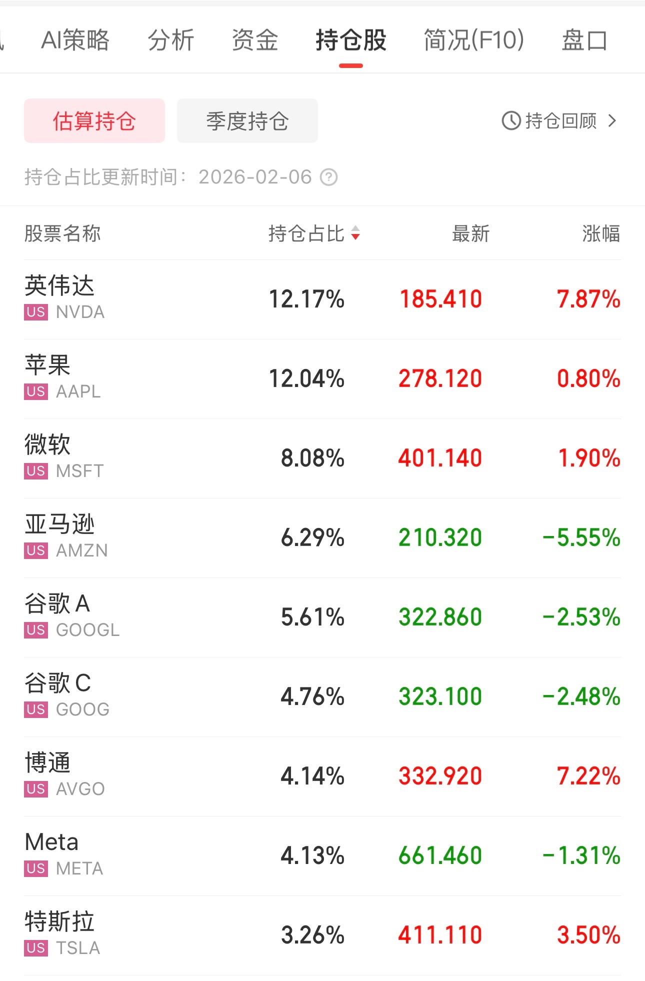 图一基金:持有英伟达19.61%,持有苹果17.38%,持有微软15.55%,这三只股占基金52.54%,如果加上第四博通,四只科技巨头占60%。图二基金:是持有特斯拉比例最多的基金,持有19.7%,加上亚马逊21.79%,两只科技巨头占40%+。图三基金:八大巨头都有,估算最新持仓,英伟达12.17%,苹果12.04%,谷歌10.37%,微软8.08%,亚马逊6.29%,博通4.14%,Meta4.13%,特斯拉3.26%,八家公司合计60.48%。