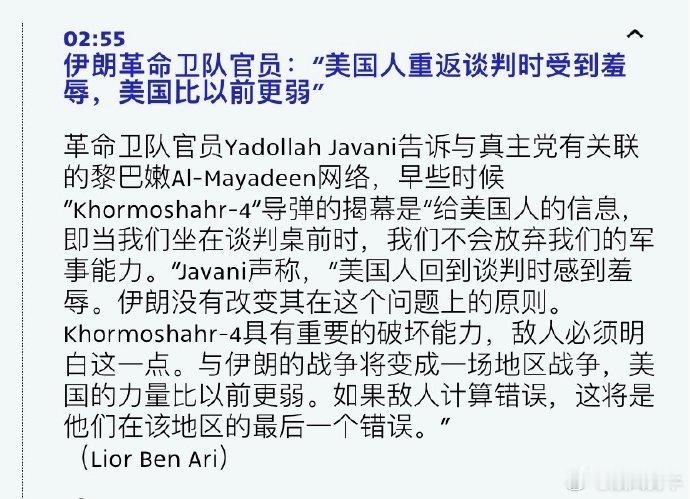 【伊朗的言辞,美国的挑战】 在中东的舞台上,伊朗革命卫队的话语如同一把锋利的剑,直指全球霸权。他们宣称美国求和,这不仅是对美国的羞辱,更是对国际秩序的挑衅。伊朗的导弹技术让美国感到前所未有的压力,仿佛它已成为一个脆弱的靶子,任何风吹草动都可能引发毁灭性的后果。 面对伊朗的强硬立场,美国若真的选择对抗,那么整个中东地区乃至全球的力量平衡都将被彻底颠覆。这不仅仅是一场军事冲突,更可能是一场地缘政治的全面洗牌。 在这个关键时刻,国际社会需要重新审视与伊朗的关系,寻找和平共处的新途径。只有通过对话和合作,才能避免战争的悲剧,维护世界的和平与稳定。海外新鲜事