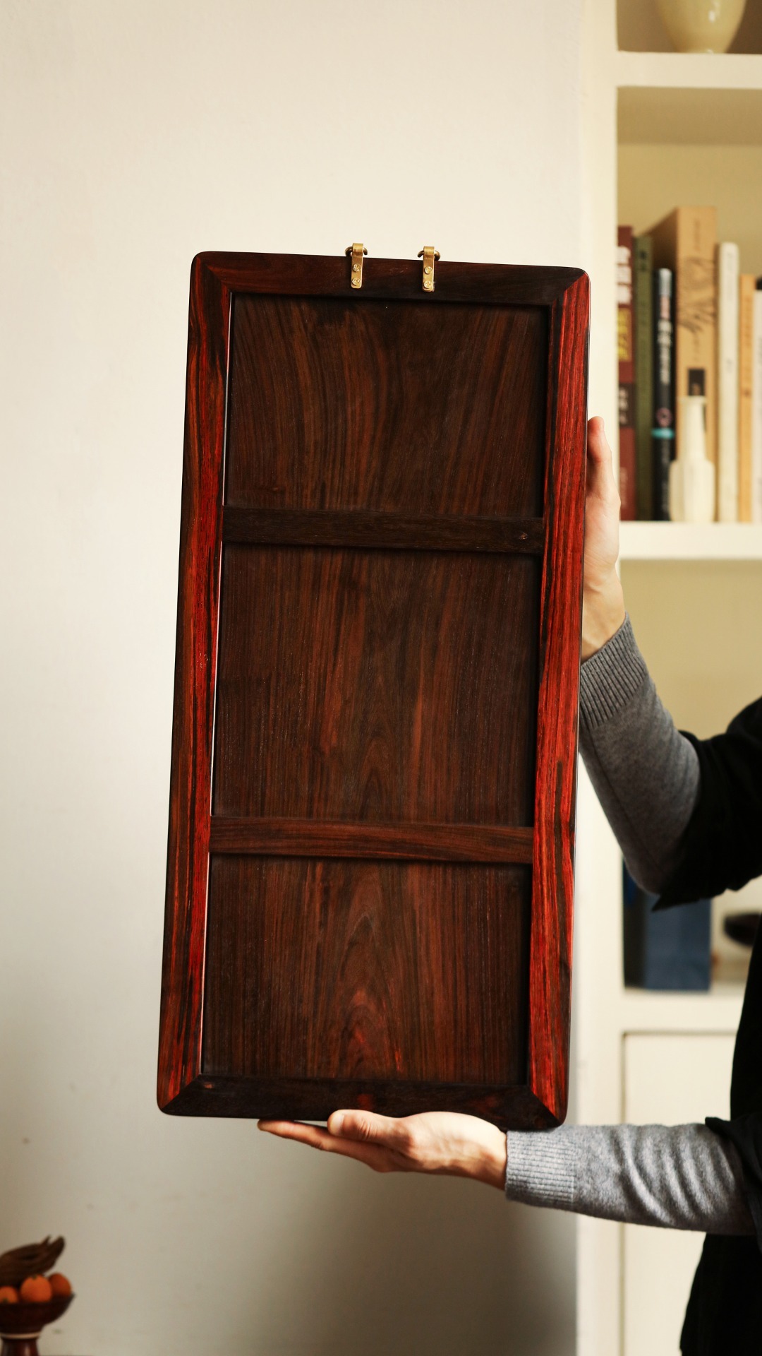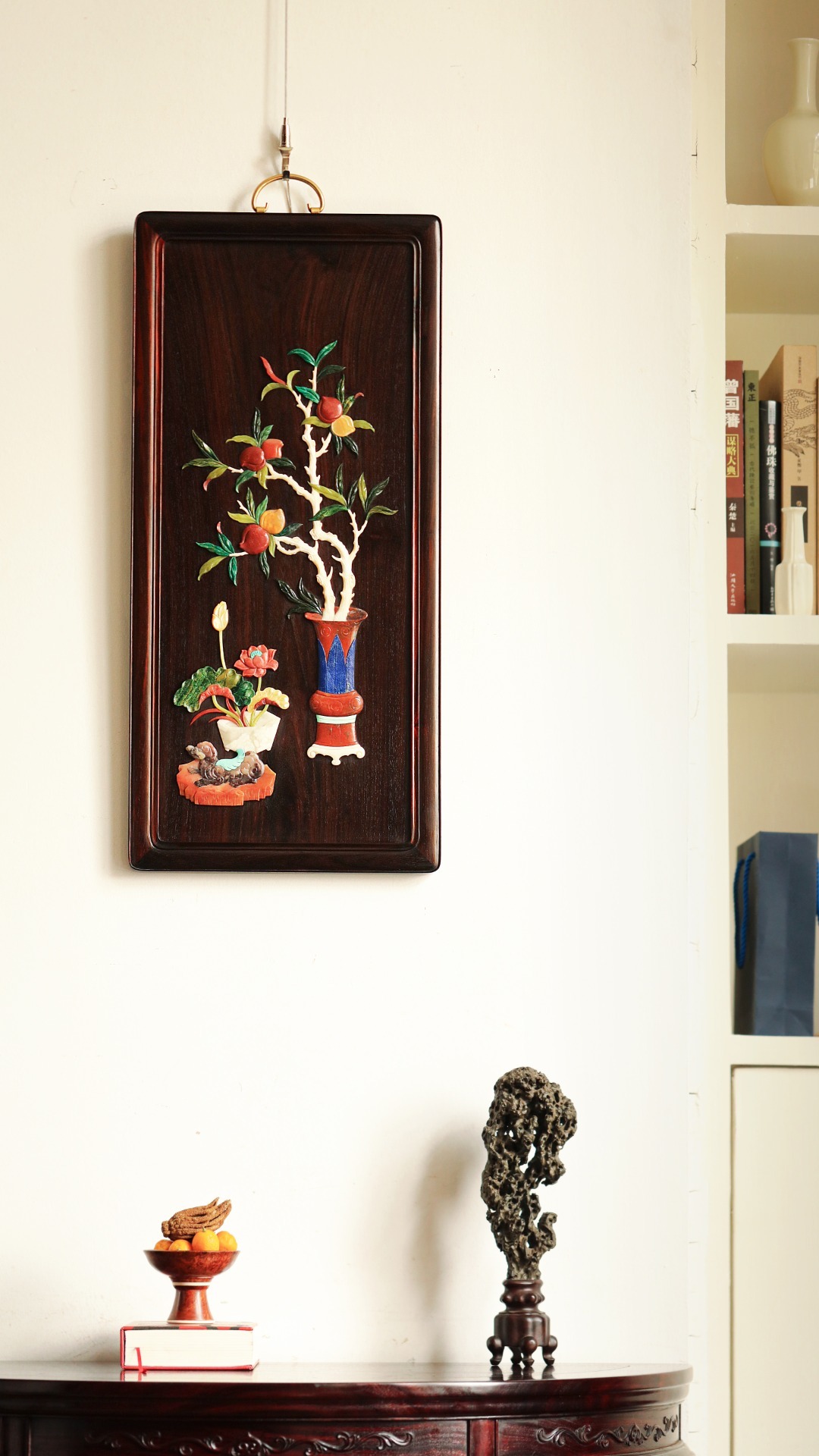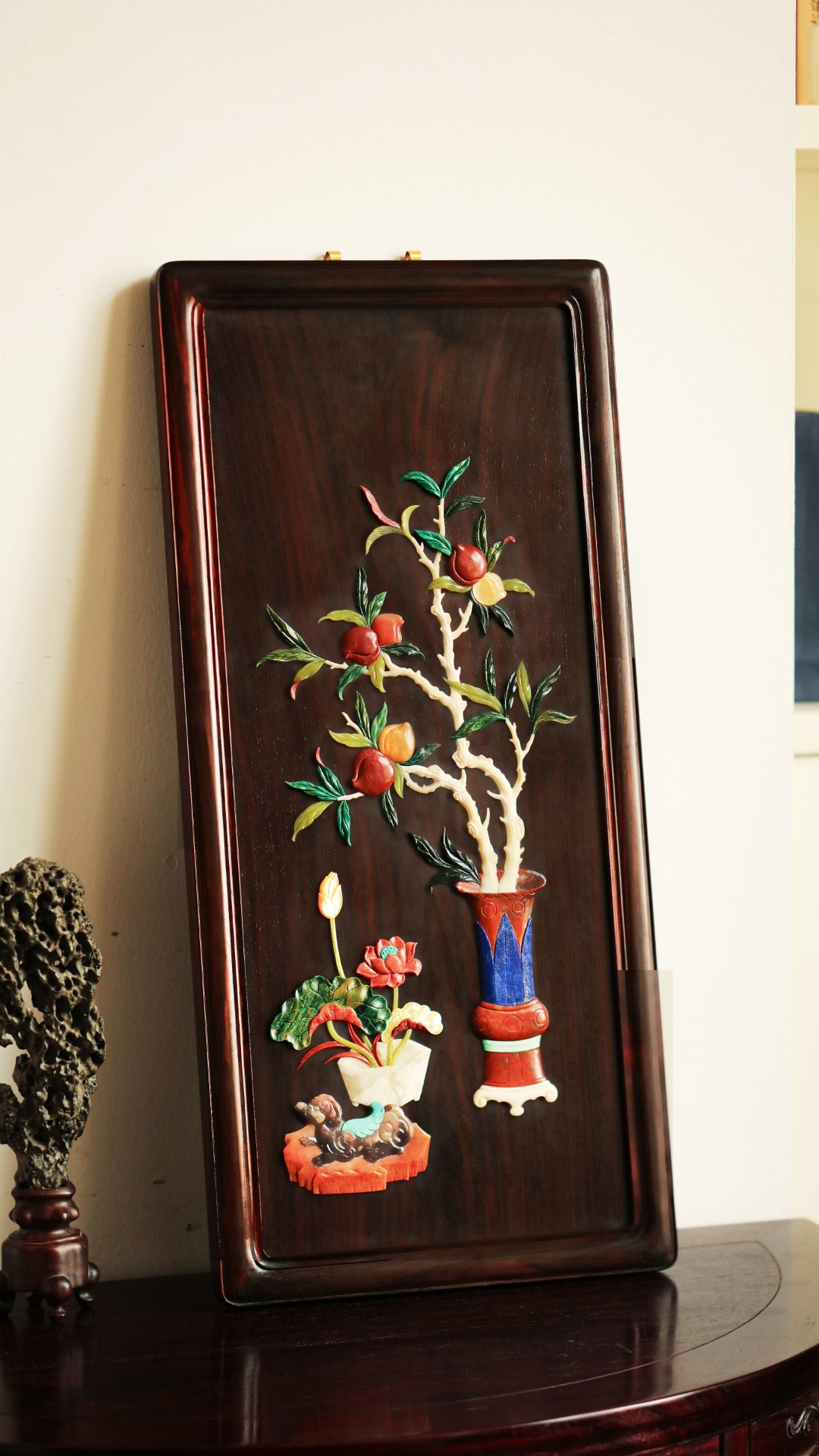 以大红酸枝边框,独板老料全榫卯工艺,镶嵌百宝嵌清供图案,富贵典雅。用色清雅,空间、雅室悬挂,清贵绚丽。
