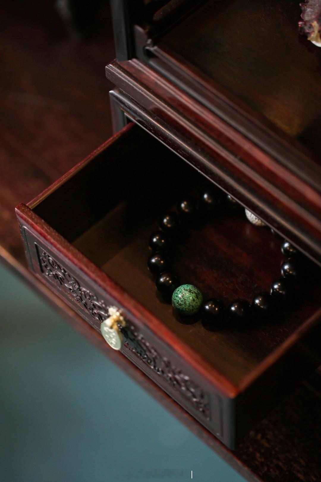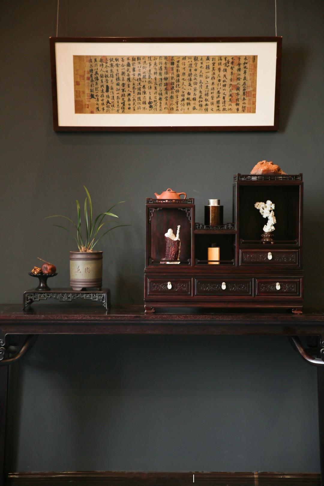 取上等紫檀木精工细制而成,以镂雕拐子纹牙饰装置台架四角。台顶饰栏杆花栏,下配内翻蹄足,抽屉雕刻雕刻西番莲纹,寓意吉祥。器韵简约大方,承置清玩,隽永文雅。