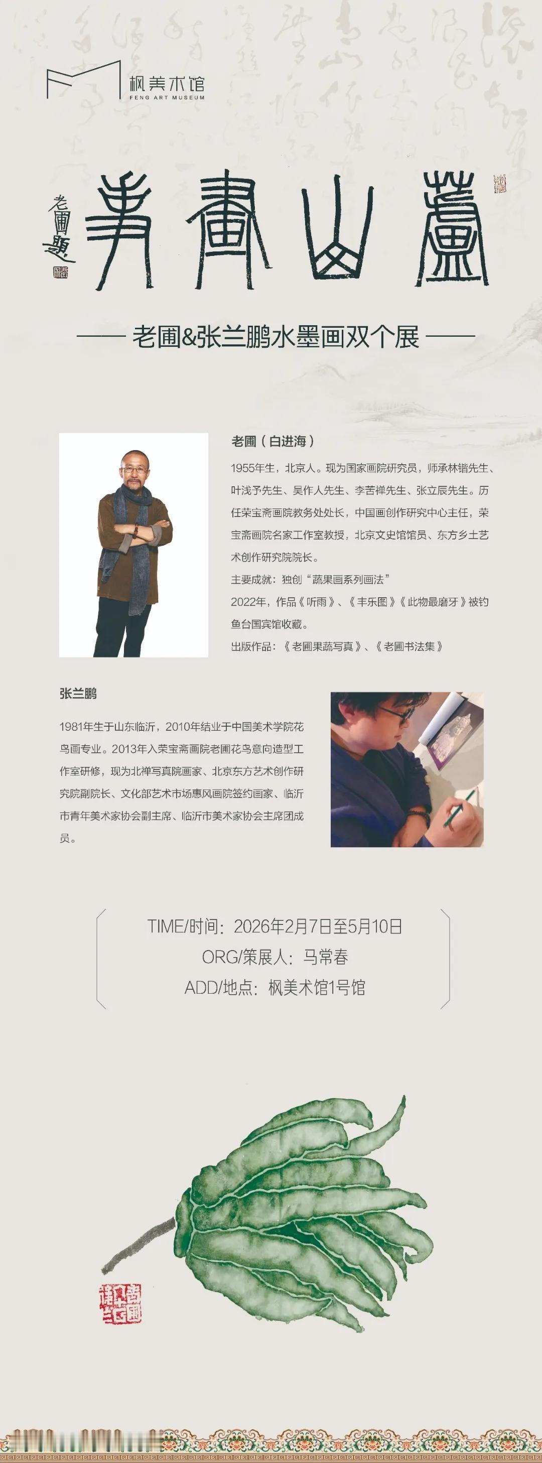 临沂文化资讯!2月7日,「芦山画事——老圃&张兰鹏水墨画双个展」在枫美术馆盛大启幕,两位当代艺术家,以山水为线索,以生活为底色,在笔墨之间,展开一场关于蔬果、风俗与心境的对话。欢迎大家留言文明交流!