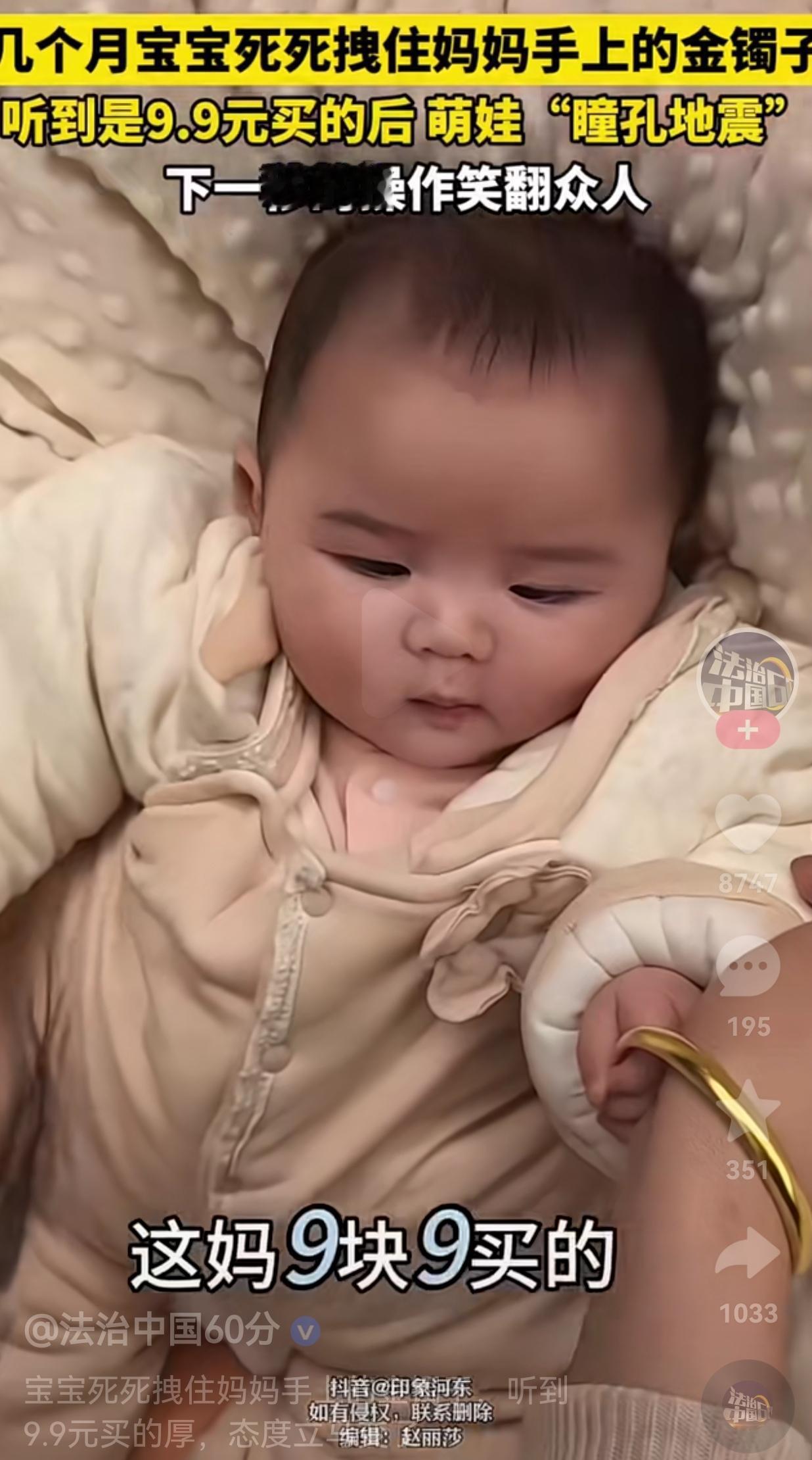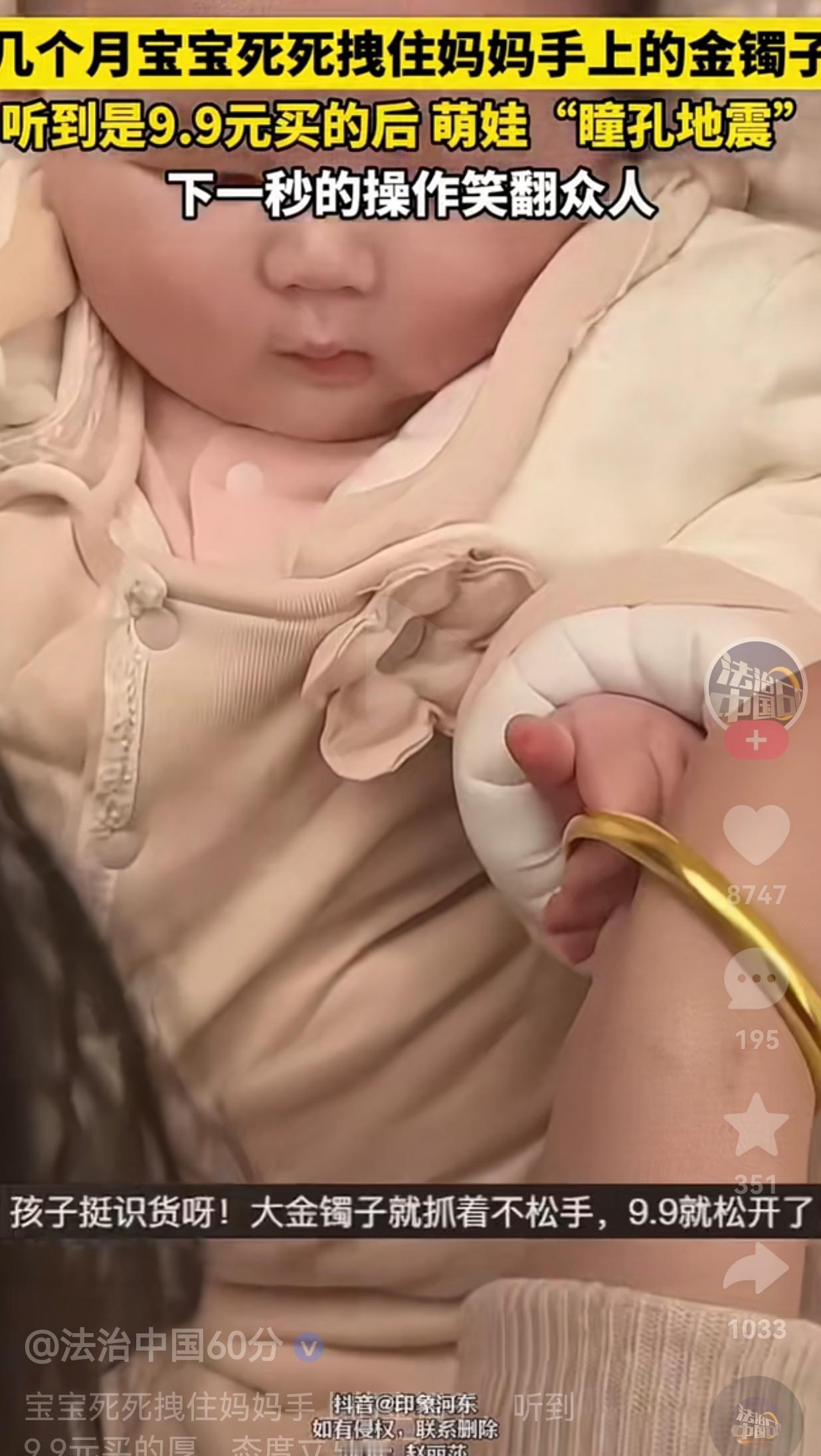 这宝宝还挺识货!一个几个月大的胖宝宝,躺在床上,妈妈就在旁边悉心照顾他,宝宝一下子看到了妈妈手上的金镯子, 宝宝两眼放光,小手直接死死攥着妈妈手腕上那根金灿灿的镯子,攥得那叫一个紧,小拳头都快把镯子捏变形了,那架势跟护着传家宝似的。 妈妈故意逗他,慢悠悠说:“这镯子啊,是妈妈9块9包邮买的。” 宝宝一听,小眼睛瞬间瞪圆了,那表情跟“瞳孔地震”似的,小嘴还“啊”了一声。 下一秒,小手“唰”地一下就松开了,那镯子“当啷”一声滑回妈妈手腕上。 那反应,比大人还现实,好像在说:“啥?9块9?那我可不稀罕了!” 网友看到后评论说:“这孩子是天生的理财大师啊,知道9块9的不值钱,立马止损。” 也有的网友说: “我家娃也是,看见真金白银就往上扑,看见塑料玩具扭头就走,比我还现实。” 还有的网友说“如果不是看他年龄这么小,还真的以为他不是宝宝呢,不然,怎么知道这不是金镯子呢?” 其实啊,这哪是宝宝识货,这就是小孩子本能反应而已。 这么小的孩子,他们哪懂什么是黄金、什么是9块9?他们只是被镯子亮闪闪的样子吸引,攥紧是因为喜欢。 一听妈妈说“不值钱”,松手也不是嫌弃,而是被“9块9”这个陌生的词儿给晃了一下,小脑袋瓜里可能在想:“哦?原来不是什么稀罕玩意儿?” 说白了,宝宝的现实,全是我们大人脑补出来的。 我们总爱用成人的眼光去解读孩子的行为,觉得他们小小年纪就懂“趋炎附势”,其实他们只是跟着本能走。喜欢就抓,不感兴趣就放,活得比我们通透多了。 反观我们大人,才是真的现实。我们会因为一件东西值钱,就算不喜欢也攥着不放;会因为不值钱,就算真心喜欢也轻易放弃。 成年人的世界总在权衡利弊,总在纠结值不值,却忘了最珍贵的东西,往往是那些“不值钱”的。比如孩子的一个拥抱,爱人的一句关心,朋友的一次陪伴。 所以啊,别笑宝宝识货,他只是在做最真实的自己。倒是我们,该学学宝宝的通透:喜欢就抓紧,不喜欢就放手,别让值不值,绑架了我们的生活。 大家觉得呢?欢迎评论区聊一聊。