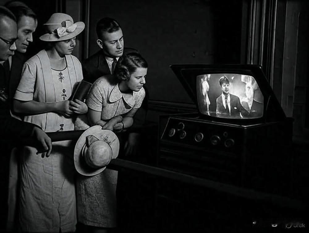 这张照片记录了 1936年8月 伦敦 滑铁卢火车站(Waterloo Station) 的观众们第一次观看电视节目的历史时刻。 画面展示了人们聚集在一起,充满好奇地注视着当时还属于新兴技术的电视机。在电视刚开始广播的年代,昂贵的设备超出了大多数人的消费能力,因此这种公开展示吸引了大量围观者。 电视机型号:画面中的设备是一台带有镜盖的 Baird 电视机。这种设计是为了解决早期显像管过长的问题,通过将显像管垂直安装,让图像投射到顶盖内的镜子上供人观看。 据记载,当时人们正在观看的是英国广播公司(BBC)最早期的电视节目。