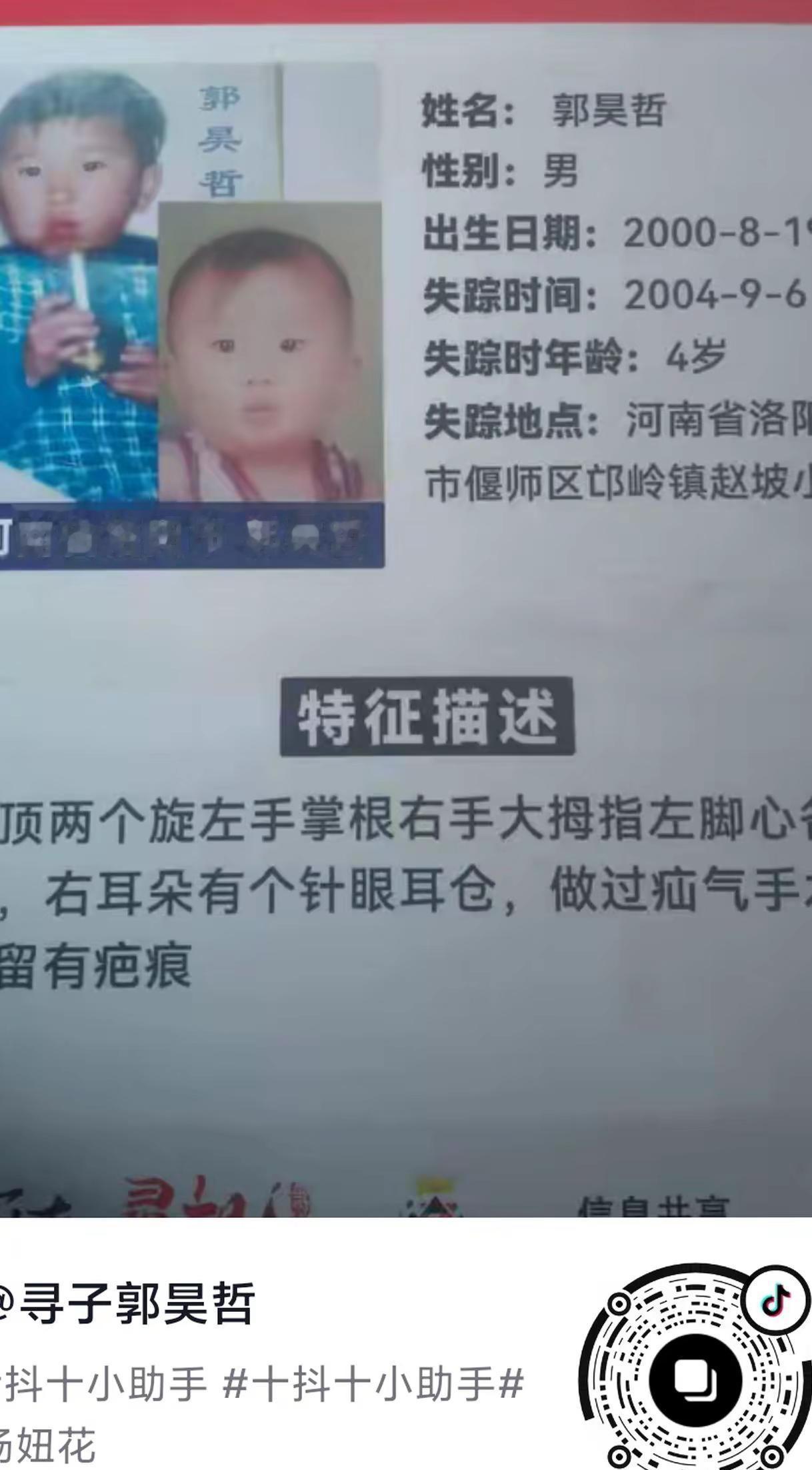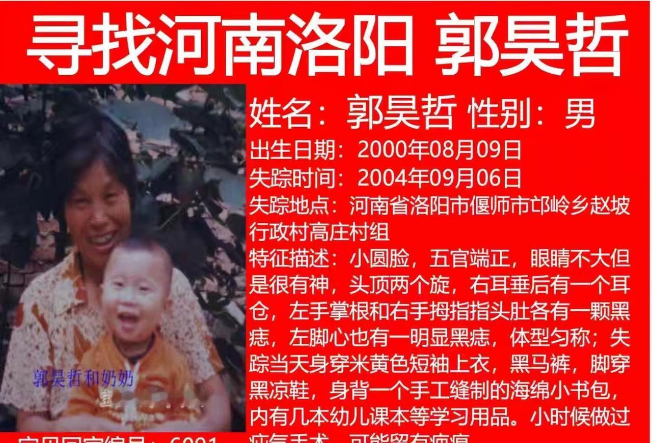 寻找河南省洛阳市偃师市邙岭乡赵坡行政大队高庄村郭昊哲,出生日期2000年8月9日,失踪时间2004年9月6日,失踪原因当天孩子在门口玩耍被一辆面包车上的坏人偷走,至今杳无音信,希望大家帮忙一起转发分享,愿早日实现天下无拐!@寻子郭昊哲 这是个真实的事情 河南省洛阳市 全网寻找 被拐儿童