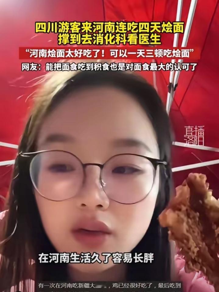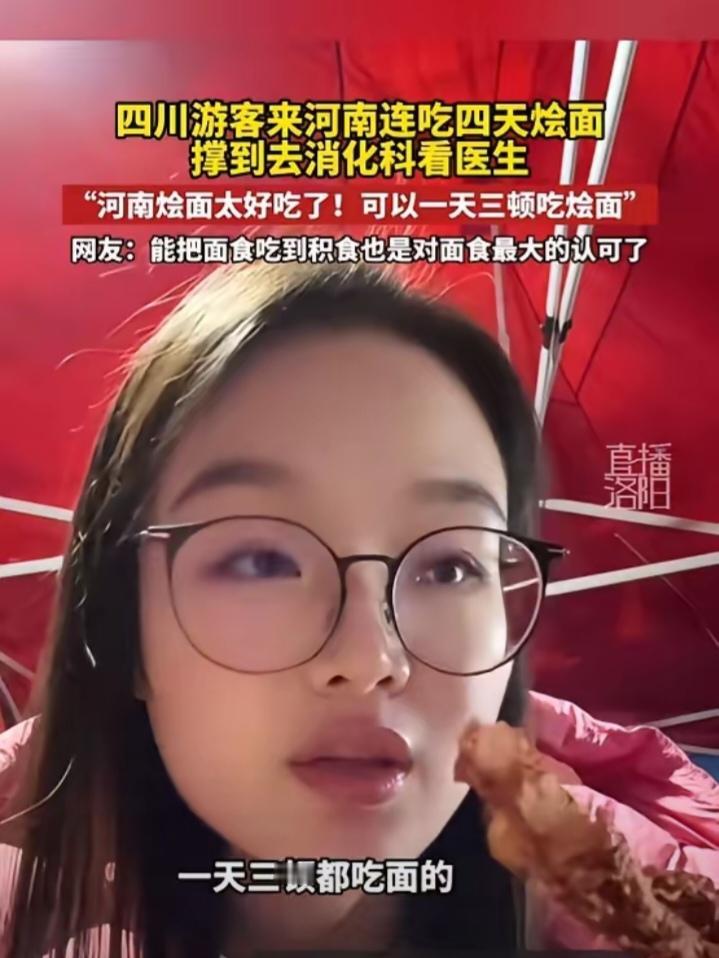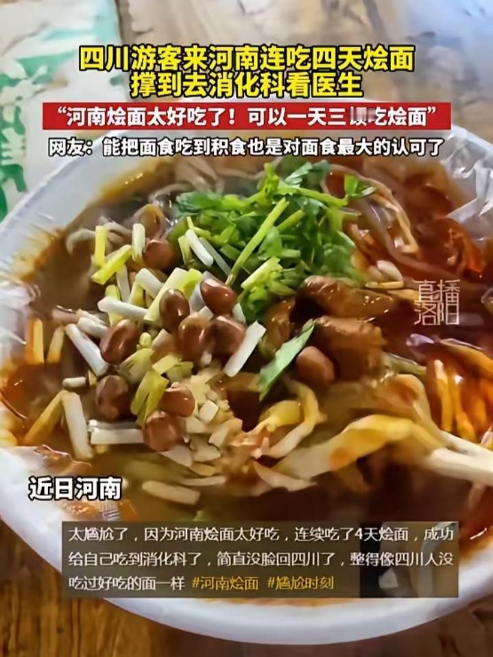 "笑不活了!"近日,河南,一四川游客来旅游,觉得当地烩面非常好吃,便连续吃了4天,不料因为吃的太撑,给自己胀到看医生,对此游客觉得十分丢人,直言自己整得像四川没吃过好吃的面一样!网友:这是对面食最大的认可! 河南烩面是当地的特色美食,浓郁的骨汤,筋道的面条,很多外地游客来河南旅游,都会特意打卡烩面,有的游客因为太过喜欢,还会连续多日食用,但千万别因为贪嘴让自己涨得难受。 据媒体2月6日报道,女子趁着空闲,来河南旅游,一方面打卡景点,另一方面就是为了吃遍当地的特色小吃,其中就包括大名鼎鼎的河南烩面。 她刚到第一天,就找了一家当地口碑很好的烩面馆,点了一碗烩面,刚上桌就被浓郁的香味吸引,尝了一口后更是赞不绝口,直言比自己想象中还要好吃。 接下来的4天里,女子彻底迷上了烩面,顿顿都吃,有时候中午吃一碗不过瘾,晚上还会再加一碗,就这样连续吃了4天,每顿都吃到撑,女子的肠胃便扛不住了。 因为实在难受,女子只能去看医生,医生仔细询问后,称女子就是因为暴饮暴食,引发了消化不良,只要清淡饮食,好好休息几天就能恢复。 事后女子觉得自己真丢四川人的脸! 这件事在网上一传开,评论区直接热闹起来,大家都被这位四川姑娘逗笑了。不少网友直呼好奇,到底是多香的烩面,能让人连着四天吃到撑,也有很多人表示被狠狠种草,恨不得马上动身去河南尝一尝。也有不少热心网友提醒,好吃归好吃,可不能暴饮暴食,肠胃不舒服受罪的还是自己。美食再香也要把握好度,可别因为贪嘴影响了游玩的心情。 各位读者你们怎么看?欢迎在评论区讨论。
