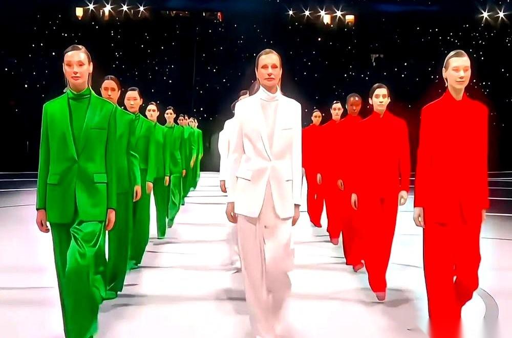 米兰冬奥会开幕式,我盯着屏幕,以为自己眼花了。 灯光压暗,一队人走了出来,脚步声踩得整个场地都在共振。 不是运动员,不是仪仗队。 镜头猛地推近,我才看清,那一排排冷峻的面孔下,裹着的不是高奢晚装,而是剪裁锋利的西装——一队是深邃的绿,一队是干净的白,还有一队是燃烧的红。 三道颜色,就这么在全场的注视下往前走,气场压得人喘不过气。 她们一步,一步,在场地中央汇合,硬生生把一条路,走出了一面流动的国旗。 这一下,我后背的汗毛都立起来了。 真狠啊。不用一块布,却让全世界看见了他们最骄傲的颜色。