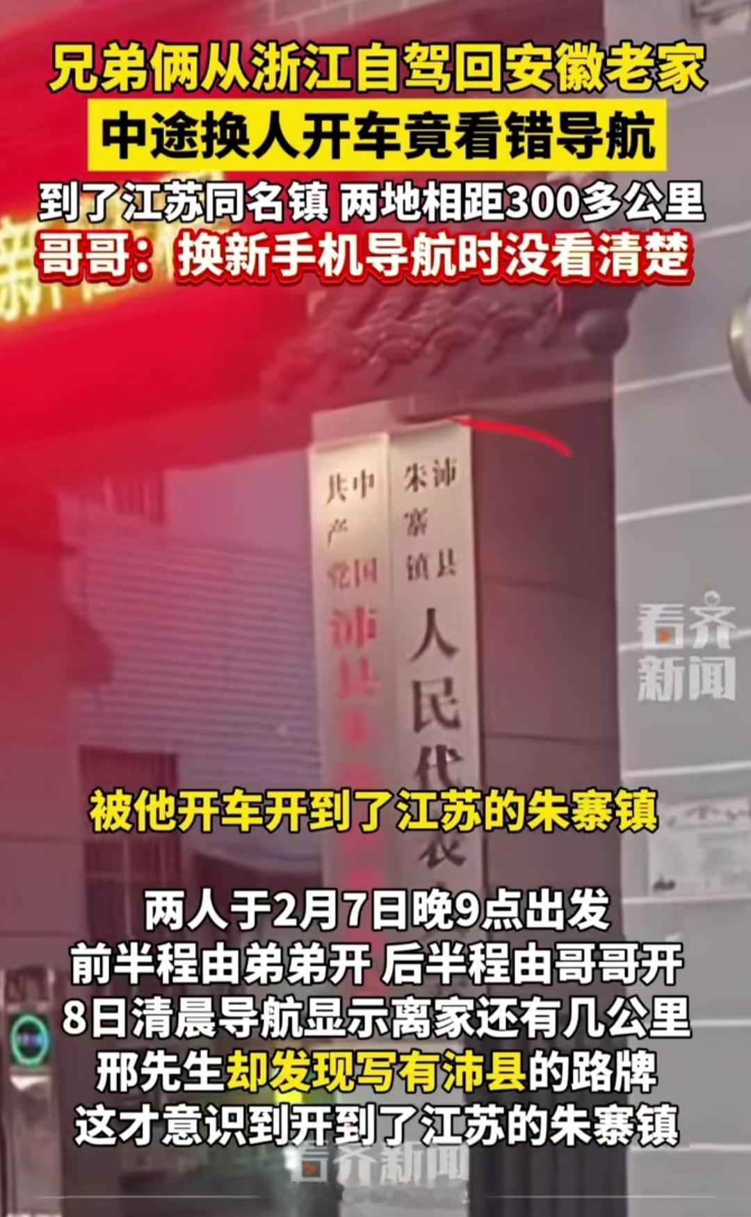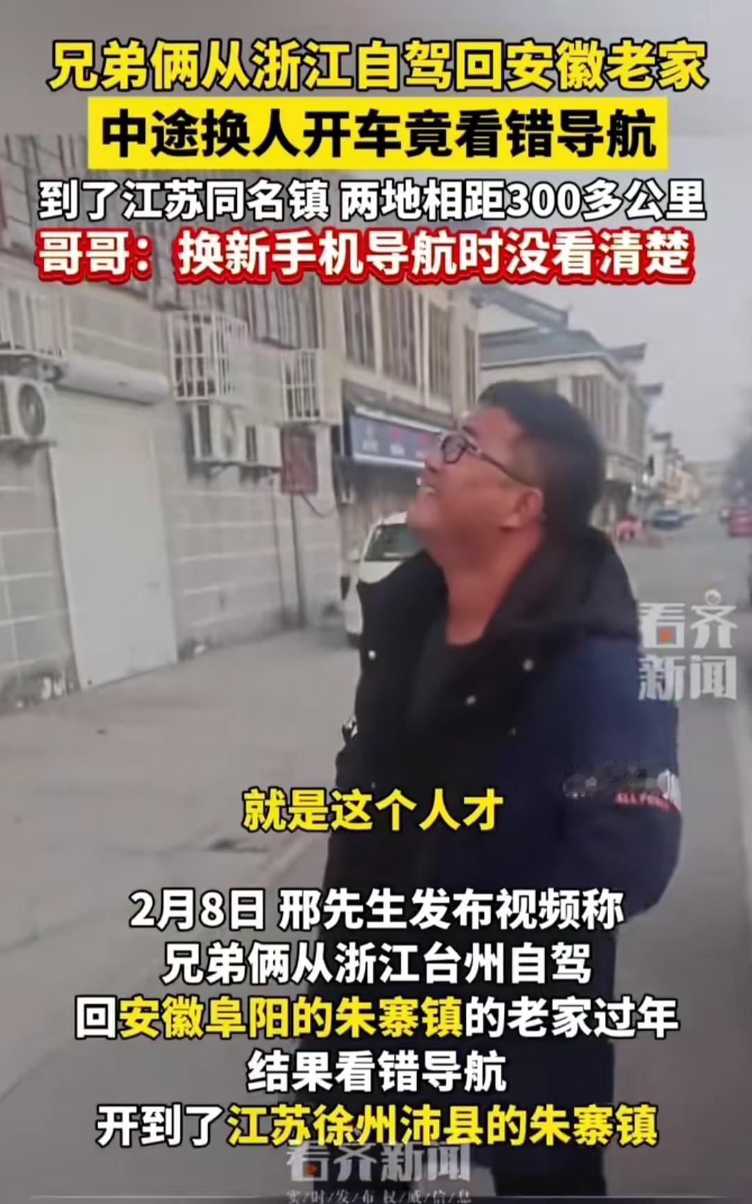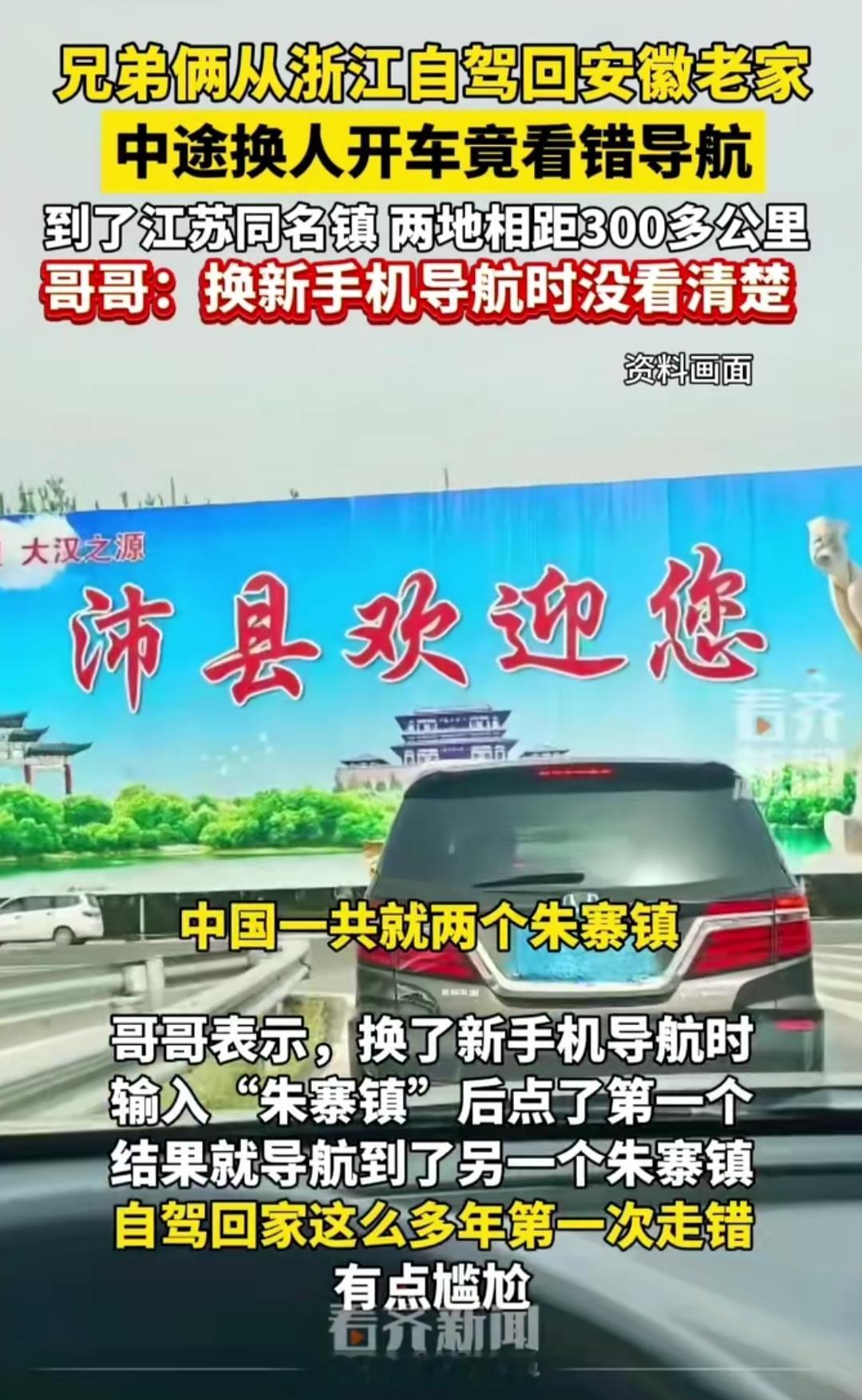 谁懂过年返乡的离谱瞬间!浙江台州的俩兄弟,7号晚满心欢喜自驾回安徽阜阳朱寨镇,想着很快就能和家人团圆。换哥哥开新车时,导航只输了“朱寨镇”没核对省份,俩人一路聊得投入,压根没留意路线跑偏。 等8号清晨导航提示“即将到达”,抬头看到“沛县”路牌的那一刻,兄弟俩直接懵圈!这哪是安徽老家,分明开到了江苏徐州的朱寨镇,俩同名乡镇让他们多绕了300多公里,堪称现实版“南辕北辙”。 老哥哭笑不得说,开了这么多年车从没犯过这错,盯着“沛县欢迎您”的牌子,尴尬得想捂脸。这波跨省乌龙也给自驾返乡的朋友提了醒:导航填地址,省份可千万别漏!