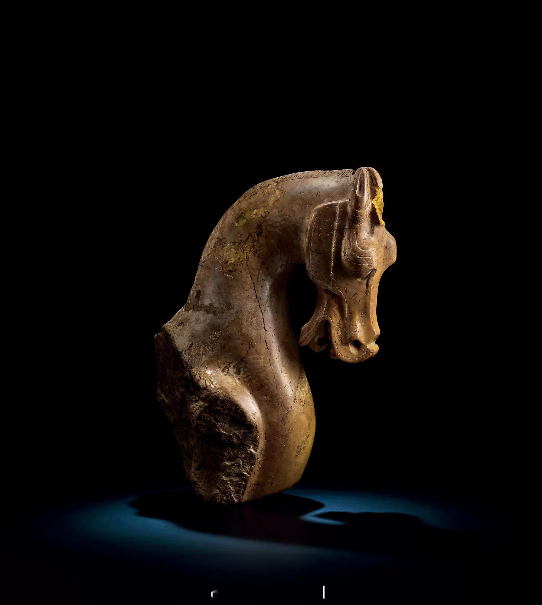 马首玉琢,玉色微黄,质地缜密,雕琢马首低垂,神形兼备,朴拙自然,线条遒劲有力,刀韵之中古意磅礴。马首瘦劲有力,鬃毛整齐,阔鼻腱颚,脸部骨胳线条清晰,张嘴露齿似正在嘶鸣。脸部的瘦长与胸部肌肉的膘肥形成对比,正是汉代汗血宝马的造型。此玉雕着意刻画马的力量及刚劲,艺术价值极高。汉代玉马尤为罕见,更为难得。