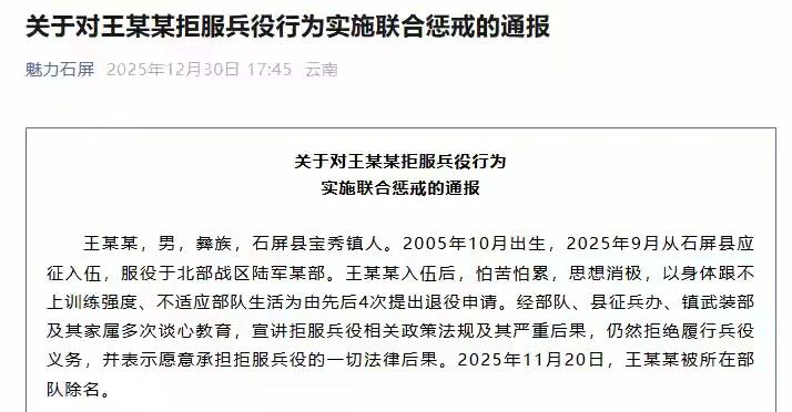 “拒服兵役一时爽,后果清单让你彻底清醒!”——被部队除名+6项硬核处罚,撕开人生最贵的一次任性 01|一个红头文件,让全村人围观“社死现场” 广西某县武装部贴出通告:22岁王某因“拒服兵役”被部队除名,退回原籍。同一天,村口大喇叭循环播放处罚决定,父母低头疾走,手机却响个不停——“听说你家娃被‘退货’了?” 这不是简单的“退伍”,而是被盖戳“逃兵”,一辈子跟着档案走。 02|6项处罚,刀刀见骨 ① 户口本永久备注“拒服兵役”,求职、贷款、考公秒变“黑名单”; ② 两年内不得出国(境),想润?先过兵役关; ③ 终身不得恢复学籍,大学白读,学费还得补交; ④ 公务员、事业单位、国企一律说NO,连辅警都考不了; ⑤ 失信联合惩戒,花呗、信用卡额度直接腰斩; ⑥ 罚款+公开通报,一人拒服,全家抬不起头。 一句话总结:18岁偷的懒,38岁还在还利息。 03|真相:不是部队太狠,是规则不能打折 我国《兵役法》白纸黑字:依法服兵役是公民义务。 拒服兵役=逃兵,逃兵=失信,失信=寸步难行。 韩国逃兵要坐牢,台湾逃兵罚百万新台币,对比之下,大陆的“社会性死亡”已算人性化。 04|彩蛋:给所有年轻人的“后悔药” 评论区留言【兵役】,我送你一份《征兵前必看10问10答》——从体检标准到心理调适,3分钟看懂“当兵到底苦不苦”。 别忘了,当兵不是选择题,是成年礼。 转发到班级群,别让下一个人生赢家,因为一时任性变成负面教材!兵役标准 入伍理由 逃兵役拒服兵役 拒服兵役案例