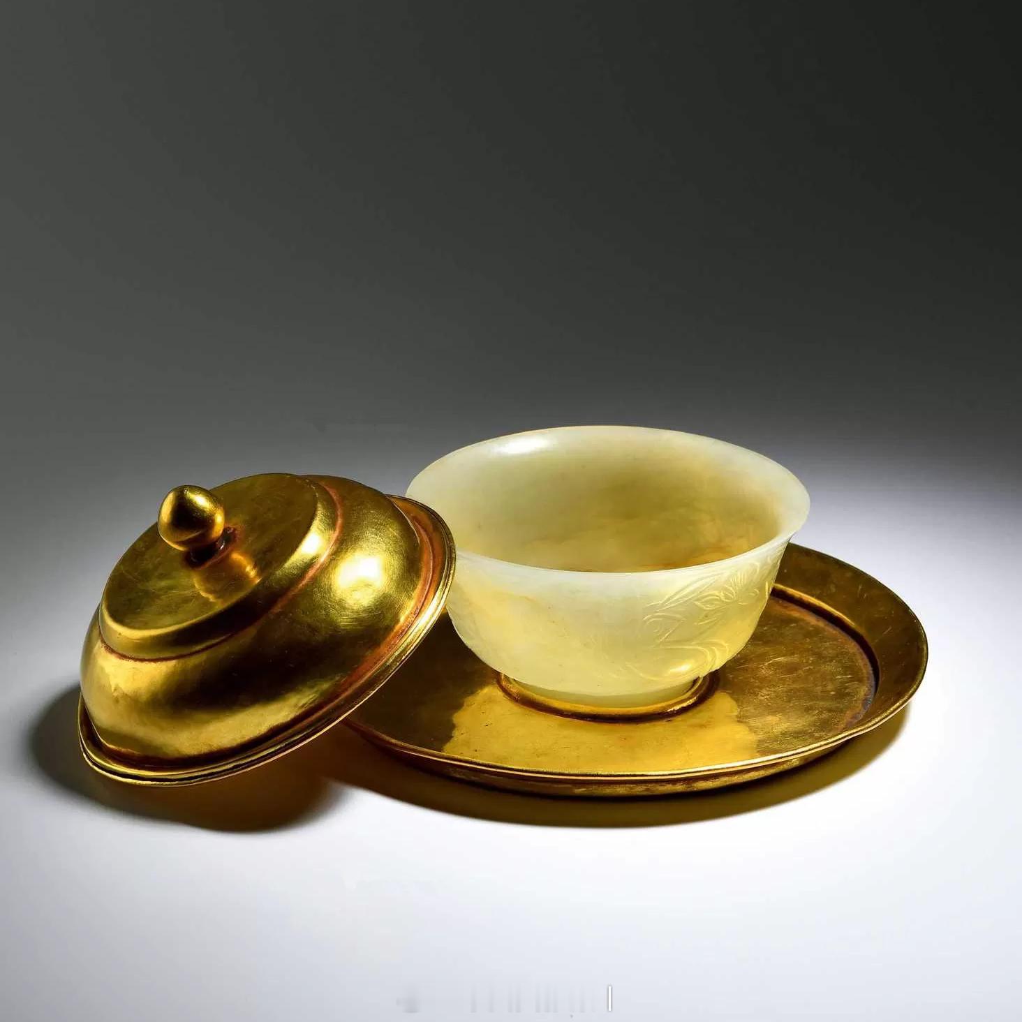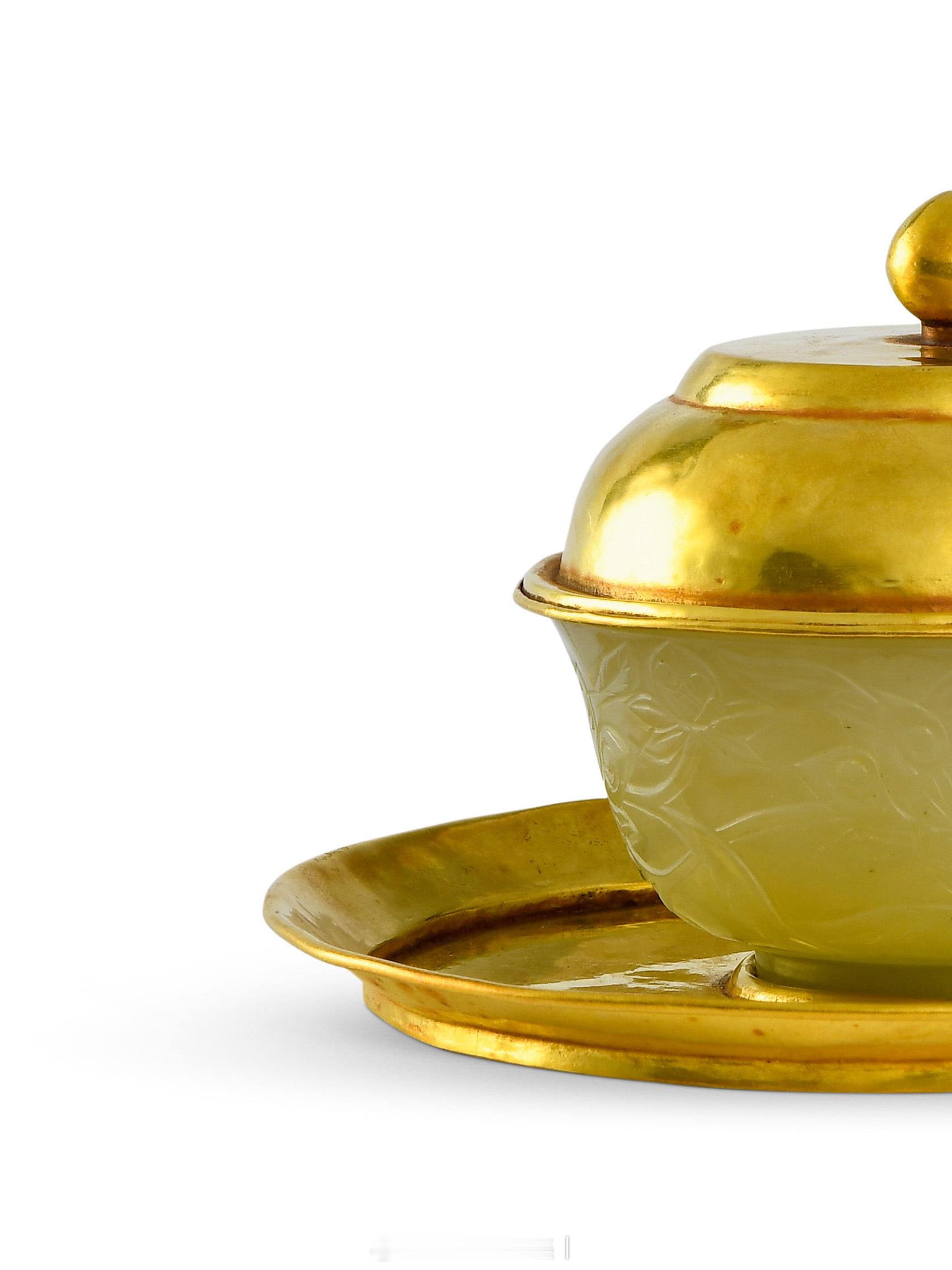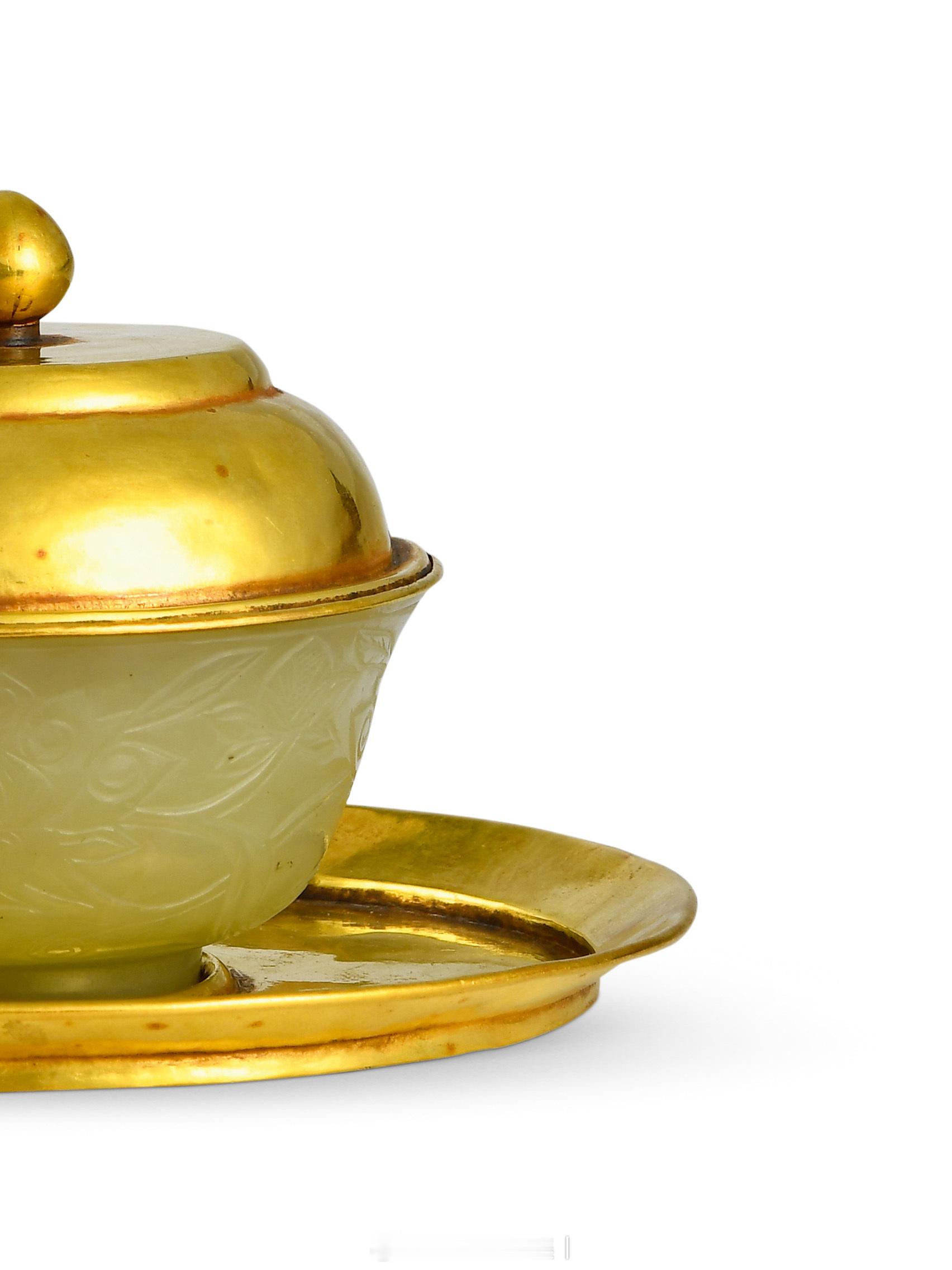 明万历官作金盖托白玉碗(一组三件)此玉碗连金盖及托。小碗为整块和田白玉掏制而成