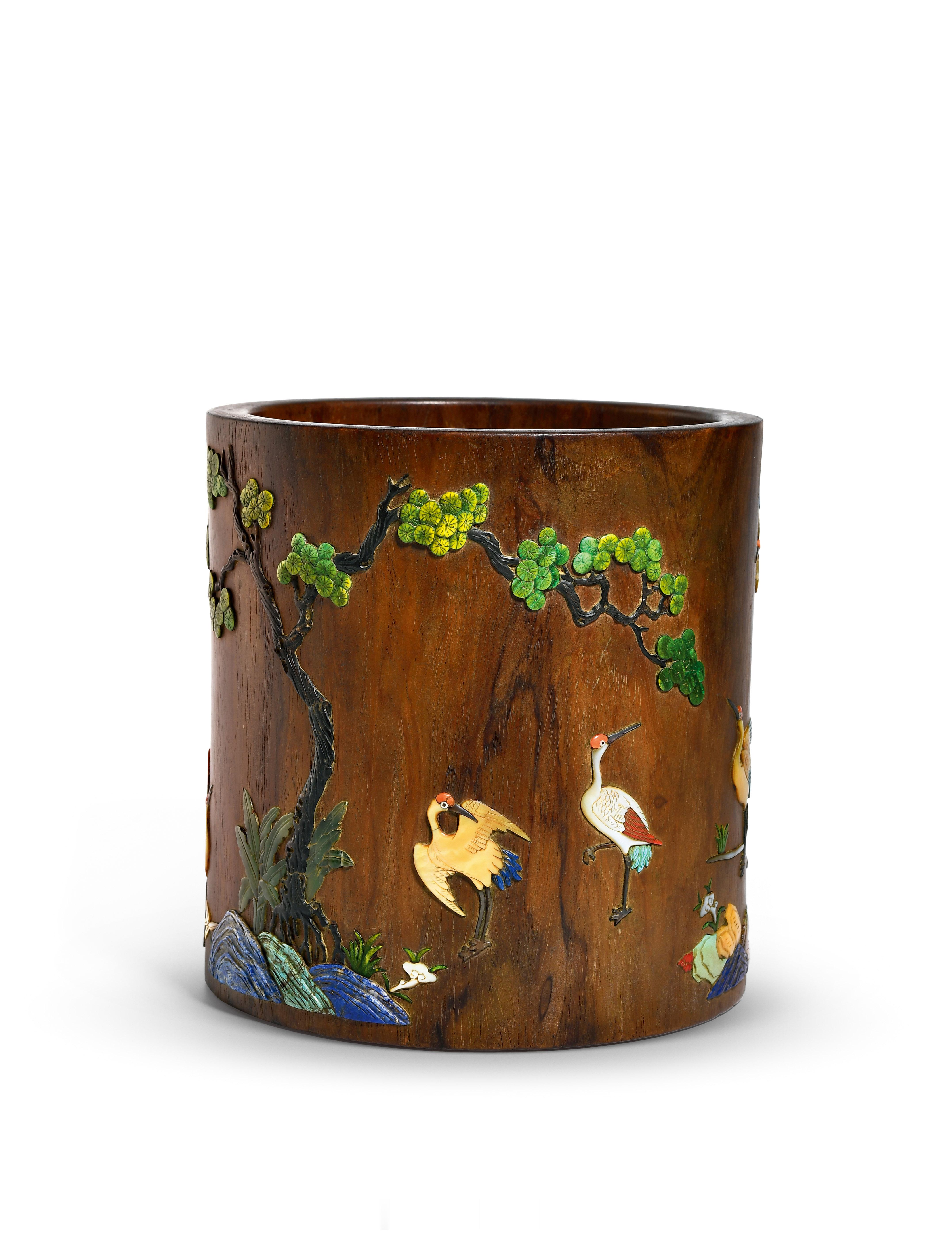 悦木集|明黄花梨嵌百宝松鹤纹笔筒笔筒以黄花梨整挖而成,嵌底,直筒做口,木质