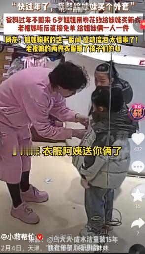 天津,2个小女孩走进了一家儿童服装店,老板娘以为她们的父母在后面,便赶紧过去迎接,谁知,她一连等了好久都不见小孩大人的身影,回头一看,2个小女孩扭扭捏捏,一副欲言又止的样子…… 二月津城,朔风凛冽。那风如不羁野马,呼啸着扑向玻璃门,撞击出“咣当”声响,似在宣泄着冬末的余威,于寂静中搅起阵阵波澜。 这是一家开了六年的童装店,店主李女士正低头整理货架,门口的风铃响了。走进来两位小女孩。年长些的不过六岁,眉眼间尚带稚嫩;年幼的那个脚步蹒跚,走起路来仍摇摇晃晃,惹人怜爱。 李女士没急着招呼,这是她的职业本能。她在等那个通常会跟在孩子身后的大人,也许是在收伞,也许是在接电话。 一分钟过去了,两分钟过去了。门口只有卷着枯叶的北风在盘旋,那种成年人世界的安全感始终没有出现。这120秒的空白,在李女士心里拉响了警报。她绕出柜台,蹲下身子,视线这才和这对衣着单薄的姐妹平齐。 “阿姨,我想给妹妹买件新衣服过年。”姐姐的声音不大,但在呼啸的风声里听得真切。 还没等李女士反应过来,一只被冻得像红萝卜一样的小手伸到了她面前。有一块的,有几毛的,零零碎碎凑在一起,大约二十多块,那是这个六岁孩子能掏出来的全部身家。 但在孩子的认知里,这是一次严肃的商业谈判。因为爸妈今年过年不回来了,她作为姐姐,必须用这点积蓄,去填补父母缺席留下的那个巨大的寒冷空洞。 望着那堆零散的零钱,李女士内心深处衡量是非得失的秤杆,刹那间颓然崩塌,只留下一片怅惘与失落。 她的丈夫常年在外跑运输,她太懂那种“想回回不来”的无奈,也太懂留守在家的孩子是用怎样残酷的“懂事”在逼迫自己长大。 接下来的三分钟,这家小店上演了一场蓄谋已久的“商业欺诈”。 面对姐姐“钱不够”的恐慌眼神,李女士祭出了成年人最温柔的谎言:“店里搞活动,买一送一,还送手套。” 这完全违反了商业逻辑,但维护了契约精神。李女士收下了那堆皱巴巴的钱,那一刻,六岁孩子的尊严保住了。 最精彩的“欺诈”发生在最后。趁着给孩子整理衣领的间隙,李女士把那把带着体温的零钱,悄悄塞回了姐姐的新口袋里。 监控探头宛如一位沉默的史官,静静伫立,以其独有的方式,悄然记录下那已然落幕的结局,于无声之中留存下一段不可言说的过往。两个穿着新棉袄的小小身影走到门口,突然停住,转身,向着李女士深深鞠了一躬。 这一鞠躬,在这个寒冷的二月下午,补齐了那二十几块钱与两件羽绒服之间巨大的价值差额。这不仅是感谢,更是两个弱小生命对善意最庄重的支付。 视频传到网上,没有煽情的配乐,却让无数人眼眶发热。同城的一位宝妈联系上了店主,执意要给孩子送几双新鞋。 当父母被迫缺席,陌生人用谎言和棉袄,把那个关于爱的缺口,笨拙而用力地补上了。 信息来源:店主回应6岁姐姐给妹妹买新衣 天津广播2026-02-06 17:59