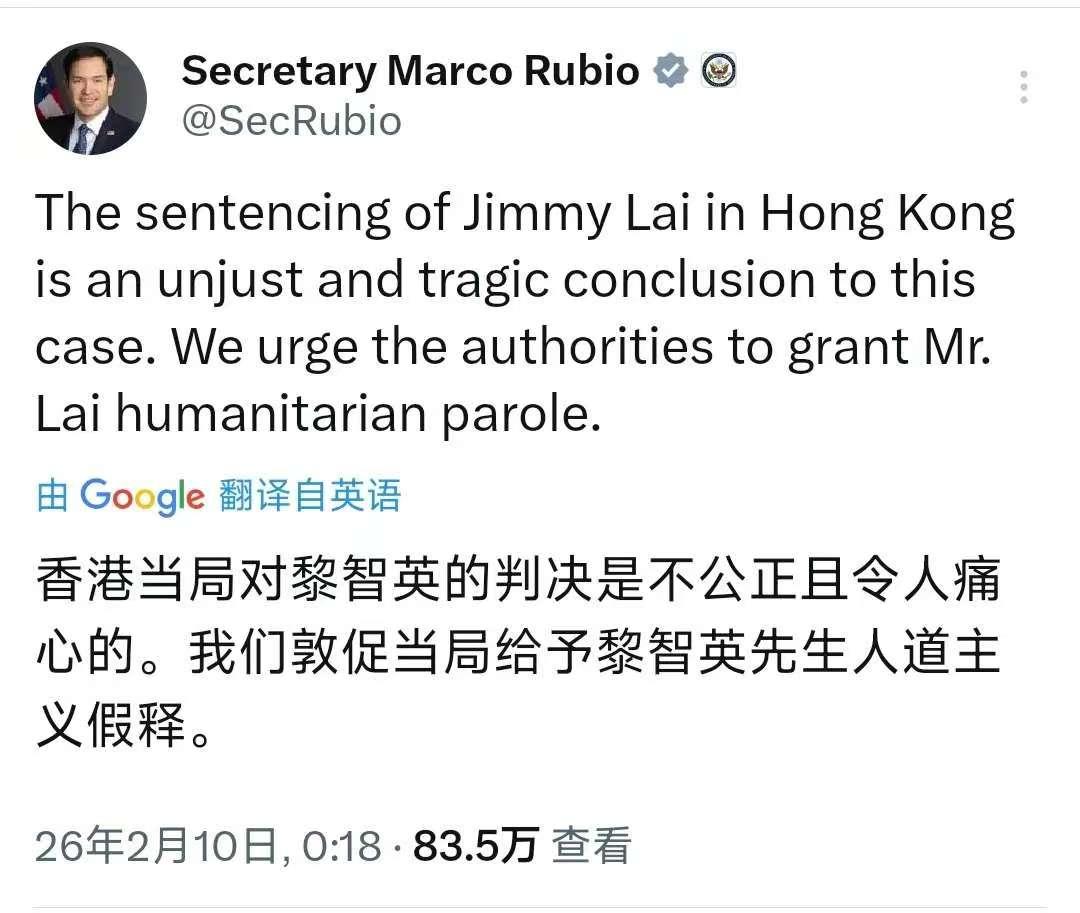 2月10日,香港审判尘埃落定,鲁比奥坐不住了,他发文写道:“香港当局对黎智英的判决是不公正且令人痛心的。我们敦促当局给予黎智英先生人道主义假释。” [机智]外部指手画脚无效,香港司法不容干涉!鲁比奥对香港司法判决说三道四、要求所谓假释,本质是借题发挥、干涉内部事务。香港法院经156天庭审、2220件证物、8万页文件依法审理,程序公开公正,判决有理有据。从国际法与国际惯例看,任何国家的司法独立都不容外部置喙,美方对本国安全案件同样从严处理。香港是法治社会,司法机关独立办案,是非曲直自有公论。 拿个案搞政治操弄,既违背法治精神,也不符合国际关系基本准则。我们维护主权安全发展利益的决心坚定不移,外部施压只会徒劳无功!